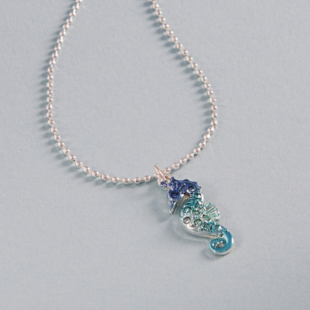 Add seaside charm to your look with this seahorse shaped short necklace. Featuring a smooth gradation print and ocean themed design, this 16 inch necklace is perfect for adding a splash of summer to any outfit. Lightweight and comfortable for everyday wear or beachside outings.