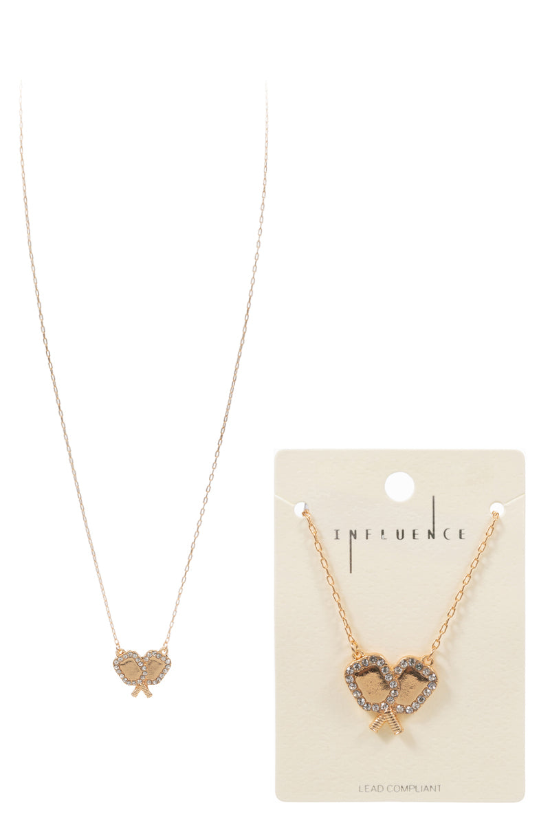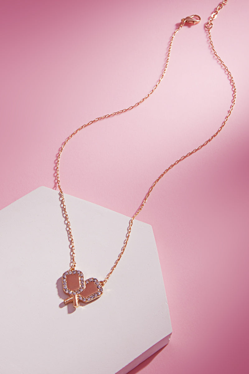 This elegant enamel necklace features a 17 inch chain and a pickleball-shaped pendant adorned with sparkling rhinestones. Perfect for any pickleball lover, this necklace adds a touch of style and charm to any outfit.