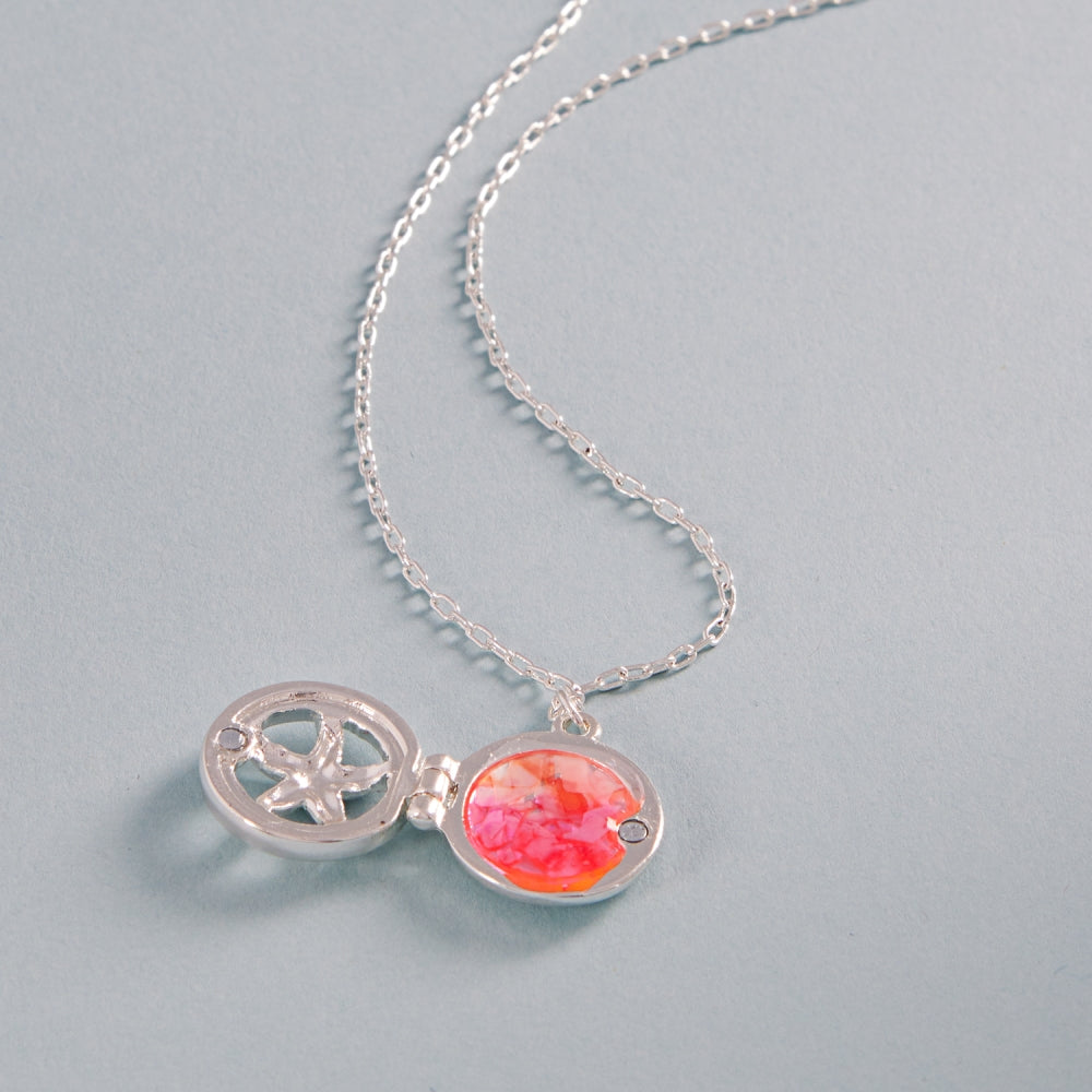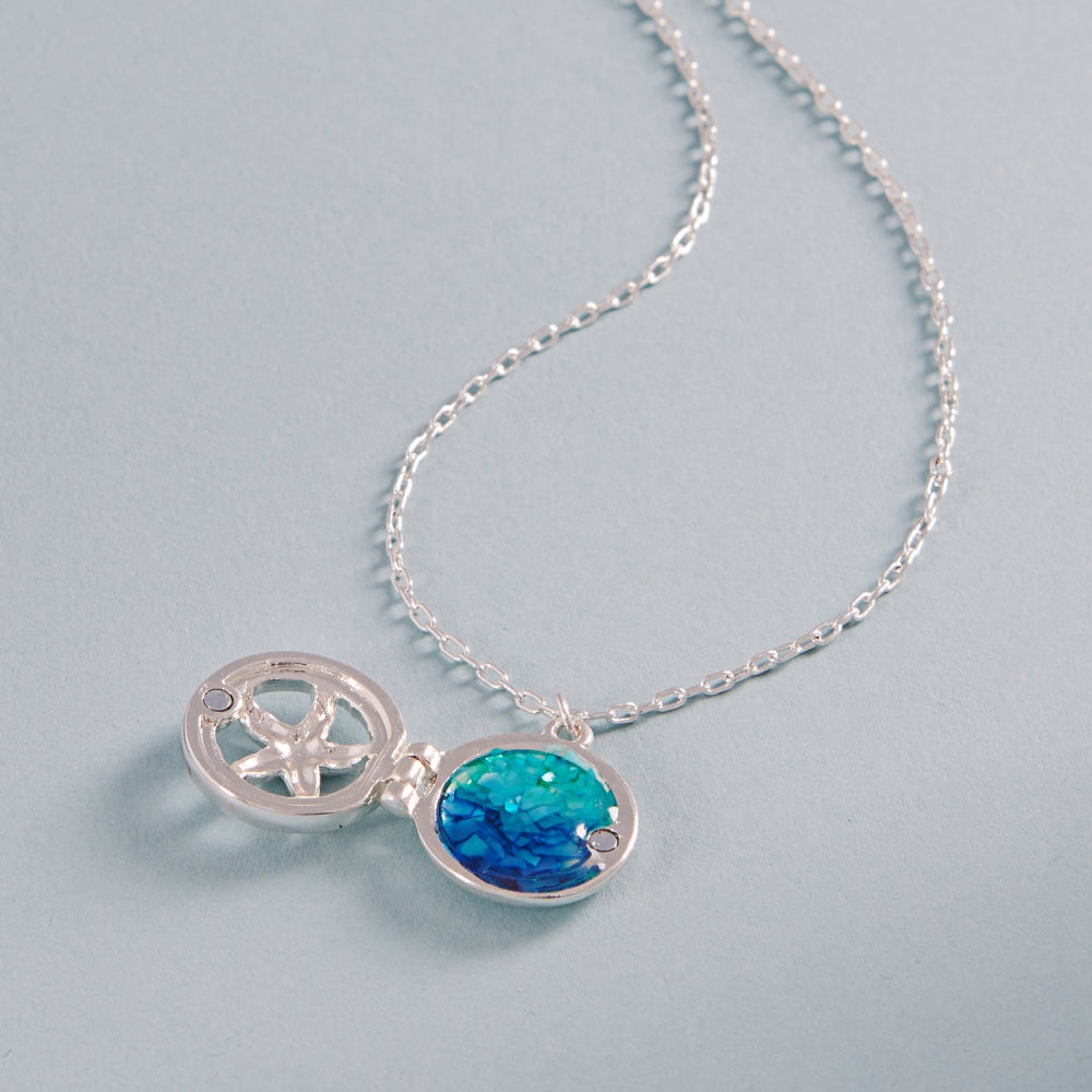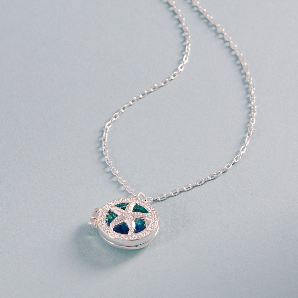 Capture the essence of summer with this starfish shaped shell locket necklace. Featuring natural chipped shell details and a charming 17 inch chain, this piece brings a soft coastal glow to your everyday look. A sweet sealife-inspired accessory perfect for beach vibes or layering.