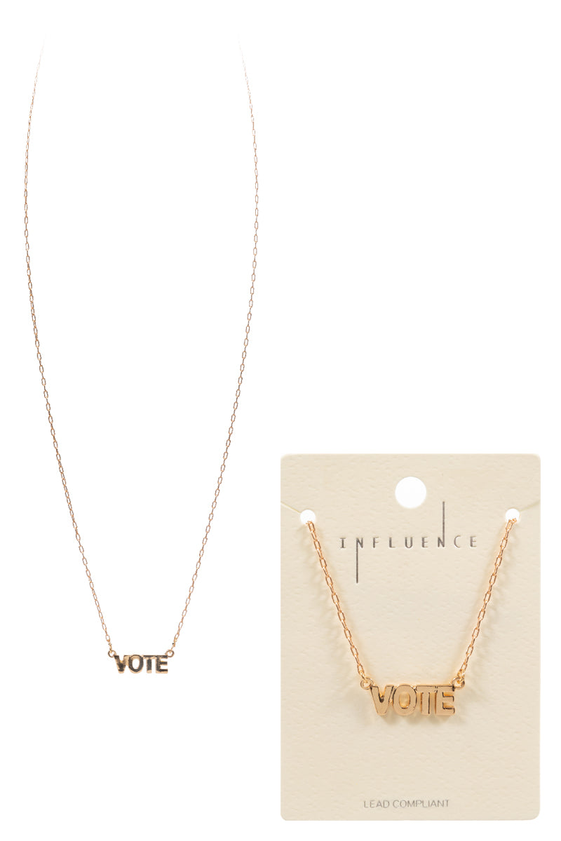 This 16 inch necklace features a vote-shaped metal pendant, making it a stylish statement for any outfit. Show your support for democracy while adding a touch of sparkle to your look. Crafted with high quality materials, this short necklace is a must-have accessory for any fashion-forward individual.
