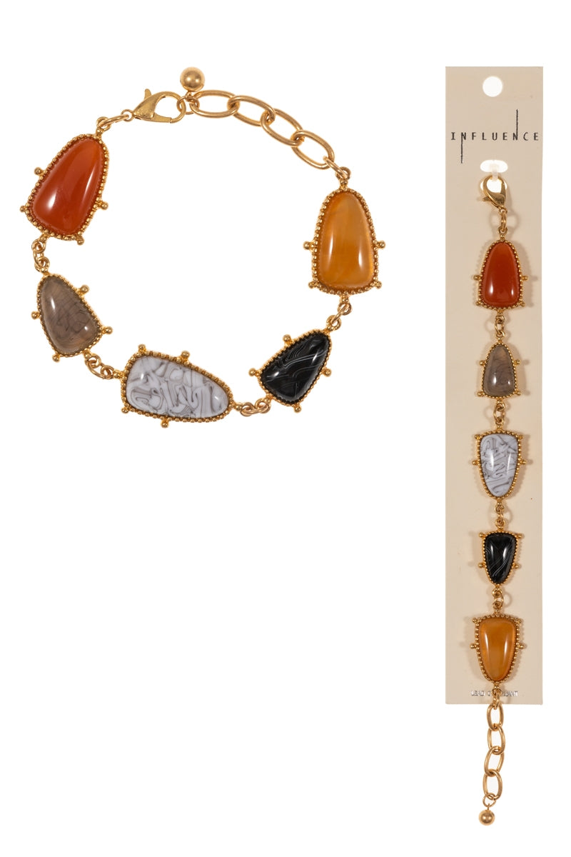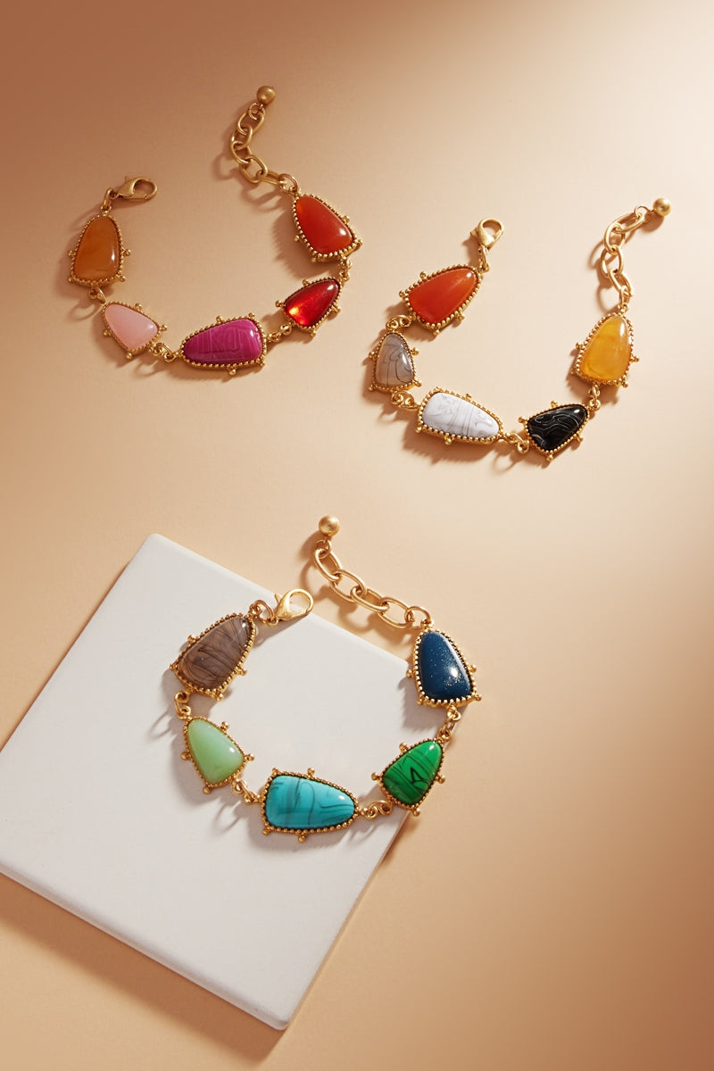 Expertly crafted with mixed shaped vintage epoxy stones, this 7.25 inch bracelet is secured with a layered clasp. Enhance your style with the unique and timeless beauty of this bracelet. Perfect for any occasion, this bracelet is a must-have addition to your jewelry collection.