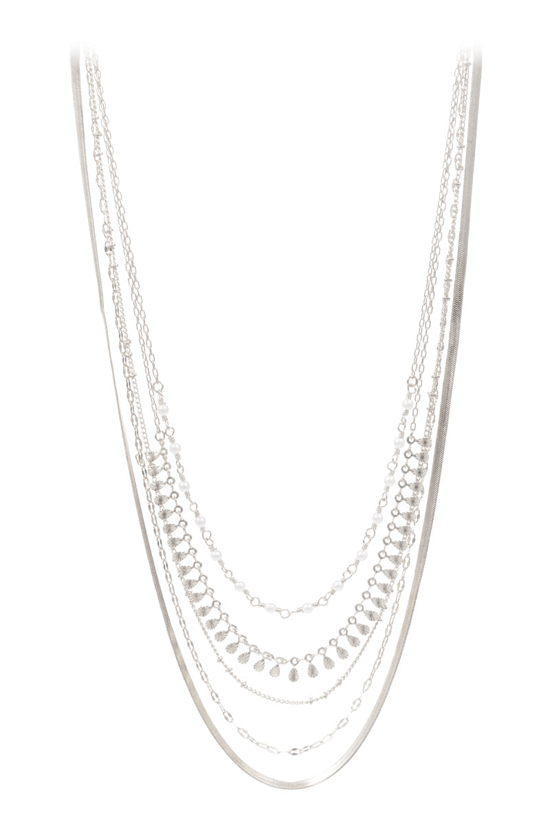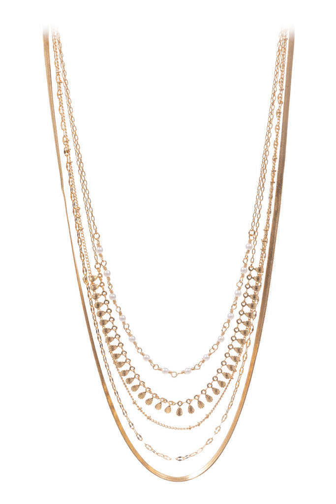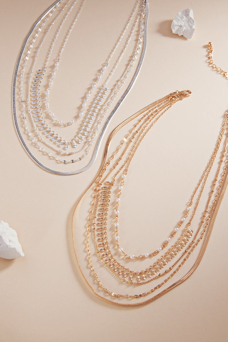 This layered chain necklace measures 14-15-16-17-8-3 inches and features a unique, chain-shaped metal design. The versatile length allows for a customizable and trendy look, perfect for any outfit.