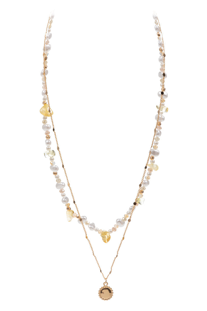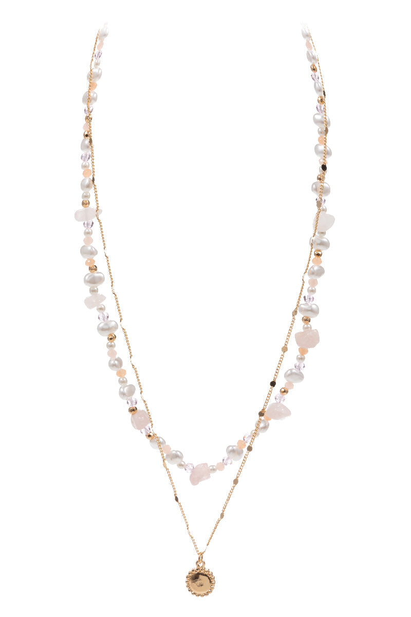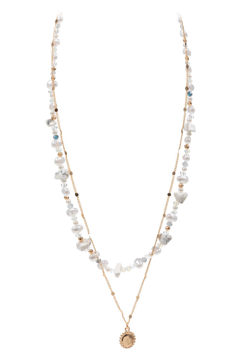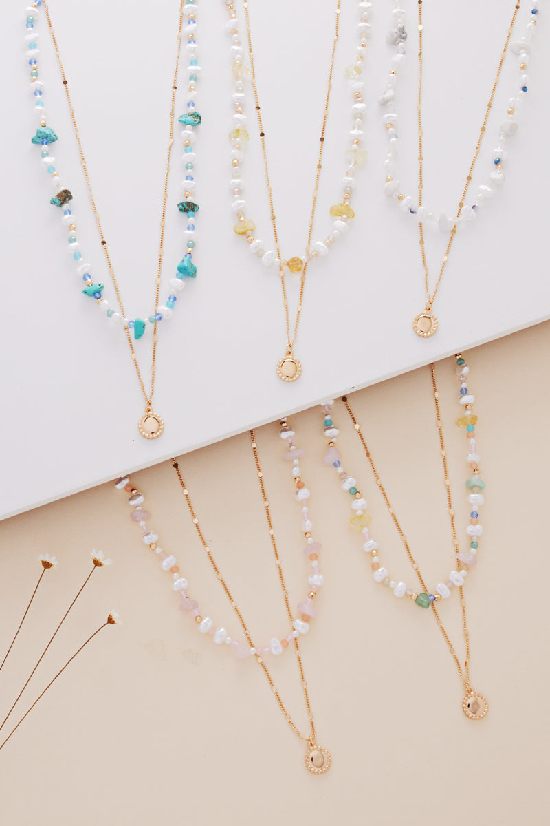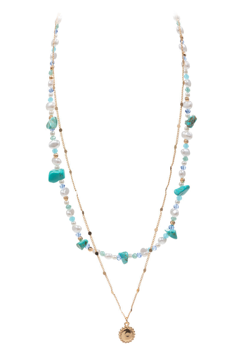 This layered necklace features a combination of 14-16 inch semi-precious stones and elegant pearls. Perfect for adding a touch of sophistication to any outfit.