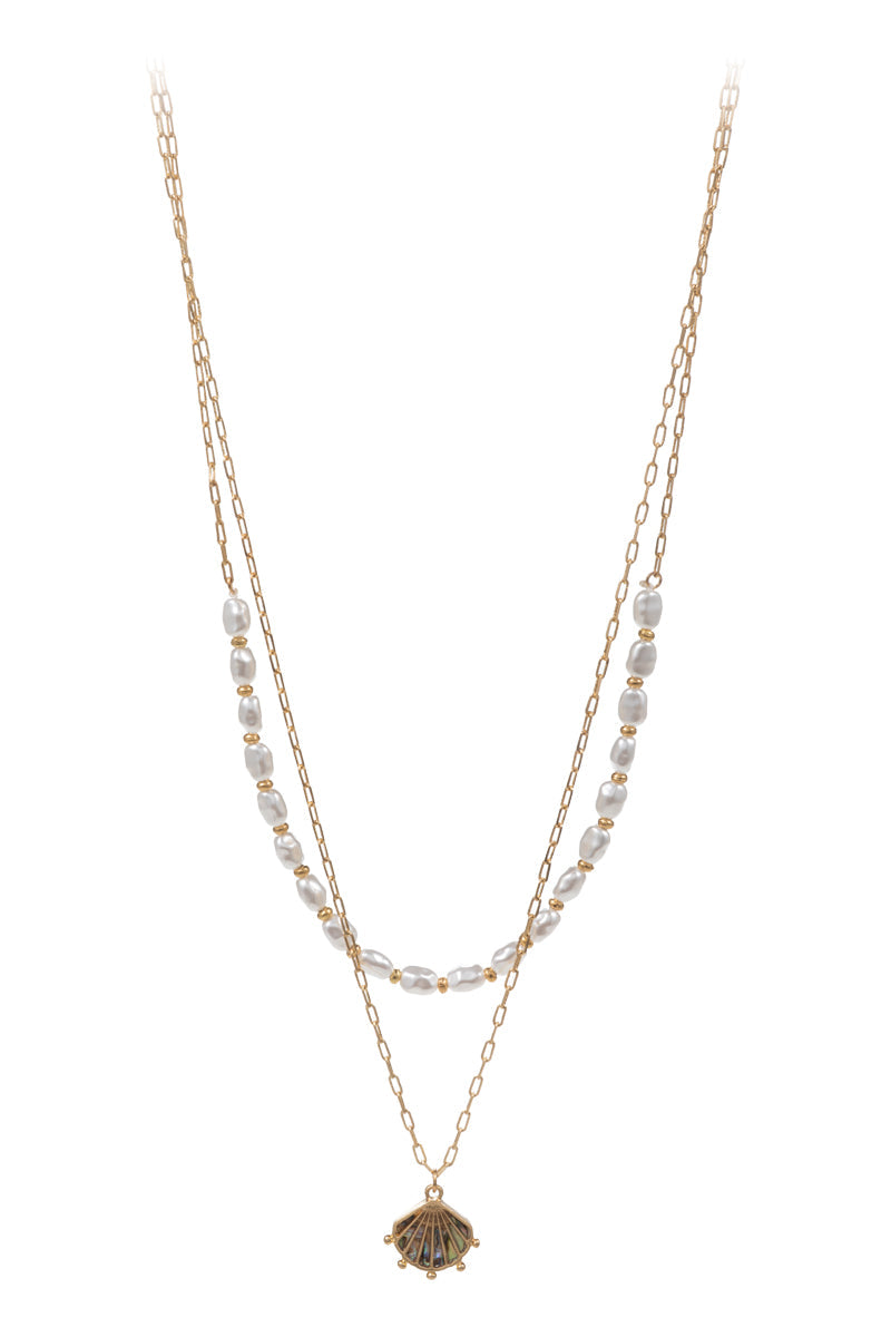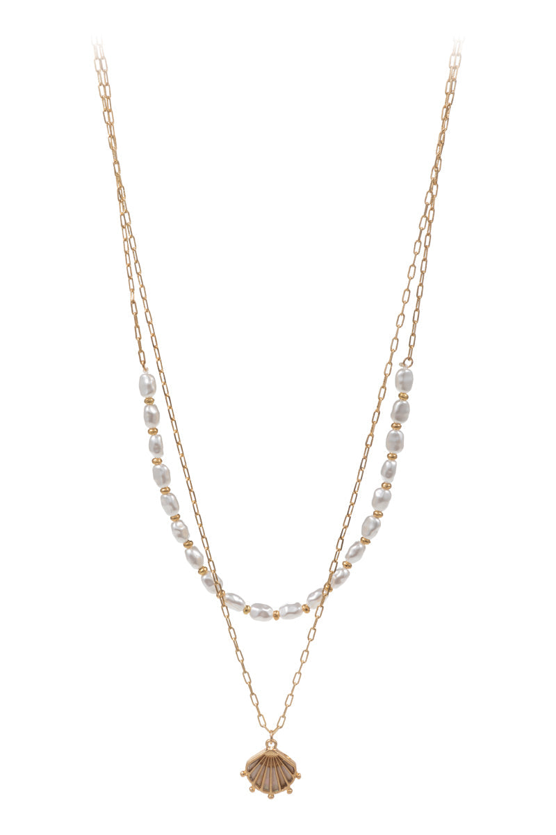 Experience elegance and sophistication with our 14+16 inch shell shaped ballpoint metal necklace. The intricate design features a stunning pearl layered pendant, guaranteed to elevate any outfit.