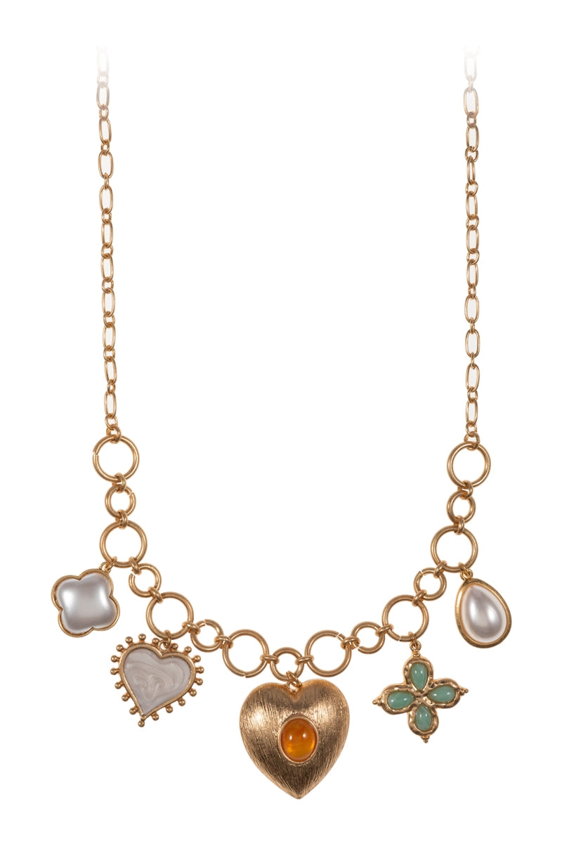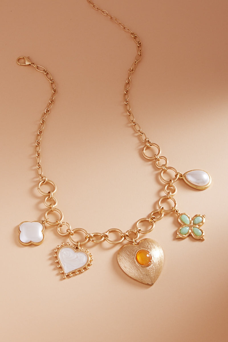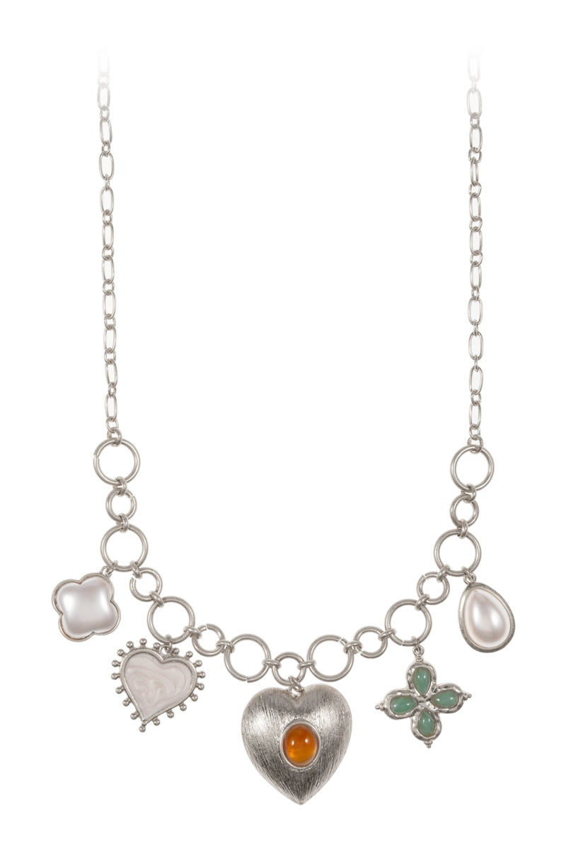 Heart Metal W Pearl Charm Cluster Short Necklace