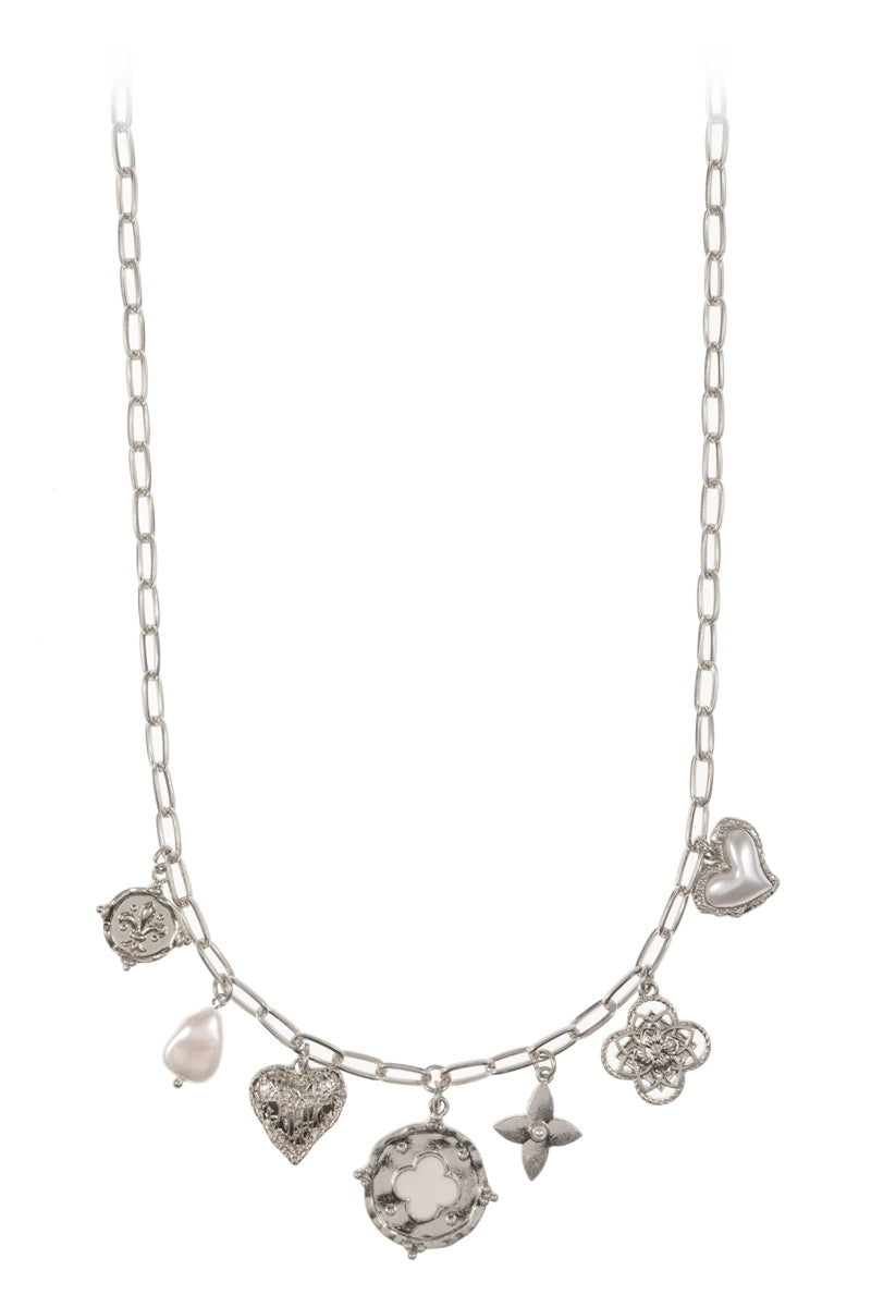 Multi Metal W Pearl Charm Cluster Short Necklace