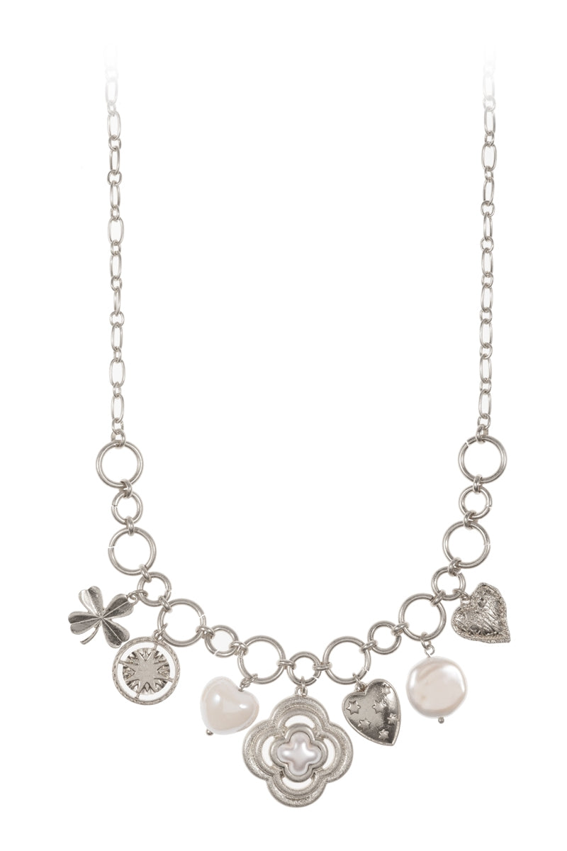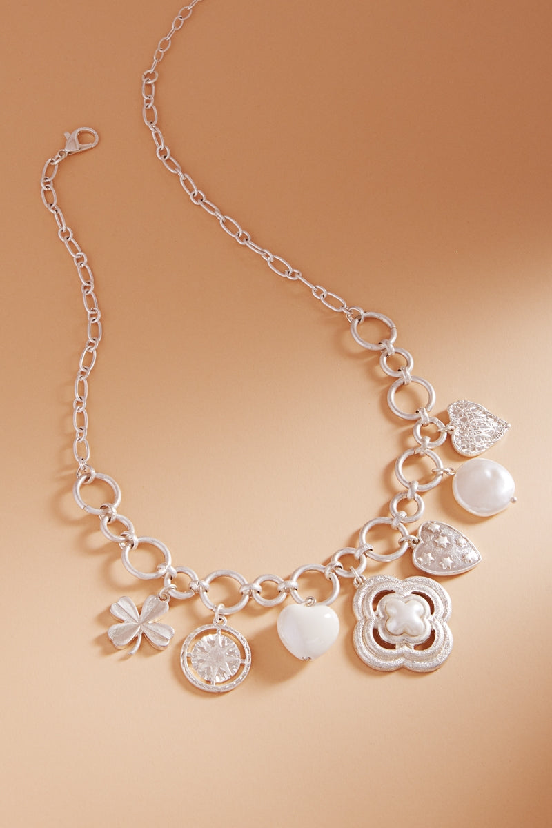 This versatile 17-inch necklace features a collection of beautifully crafted metal charms in various shapes, accented by a lustrous pearl cluster. Elevate your outfit with this short necklace that adds a touch of elegance and sophistication. Perfect for any occasion, this necklace is a must-have for any jewelry lover.