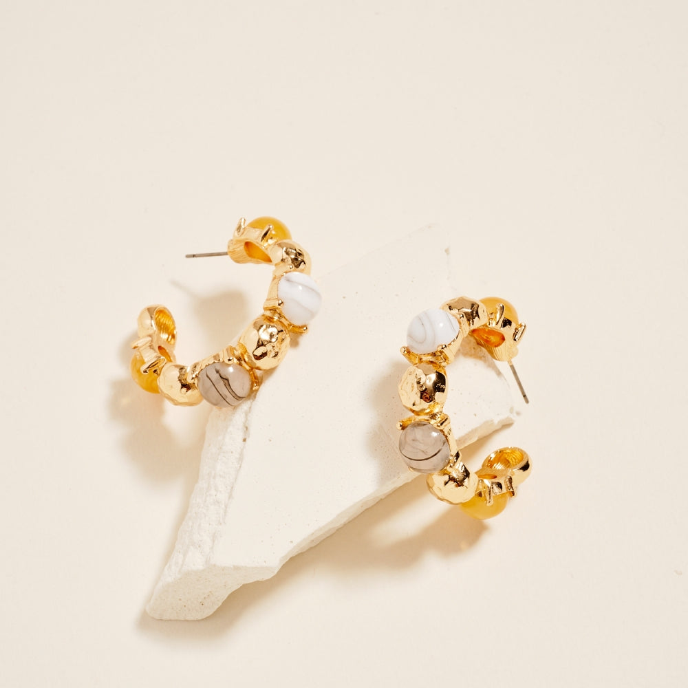 Marbled and clear resin stones come together on these 1.5 inch hoops to create a balanced and timeless accessory. The vintage inspired finish offers a soft, polished look suitable for daily wear or gifting.