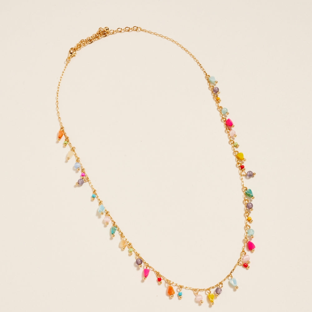 Small semi precious stone charms hang from a delicate chain, creating soft movement and eye catching detail. The mixed colors make it easy to style and perfect for layering. A charming accessory for customers who love natural gemstones.