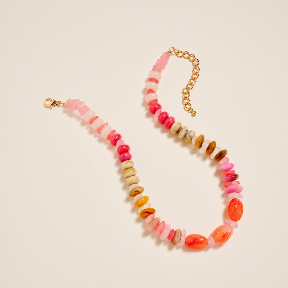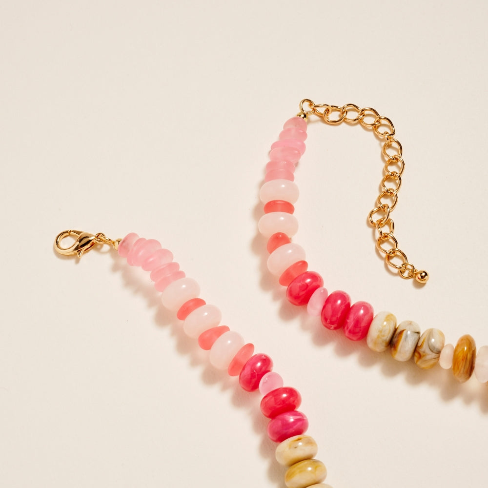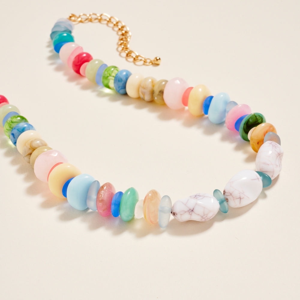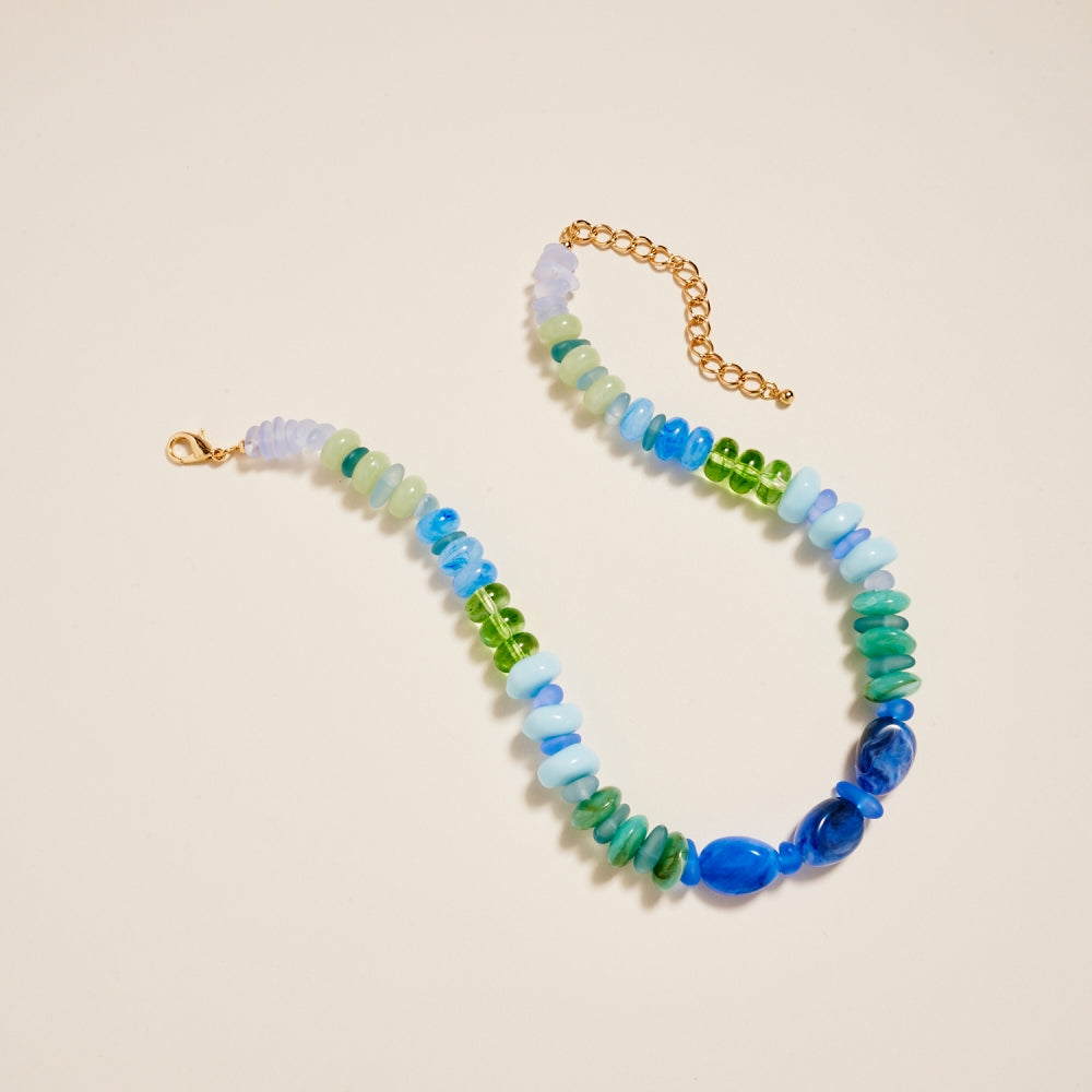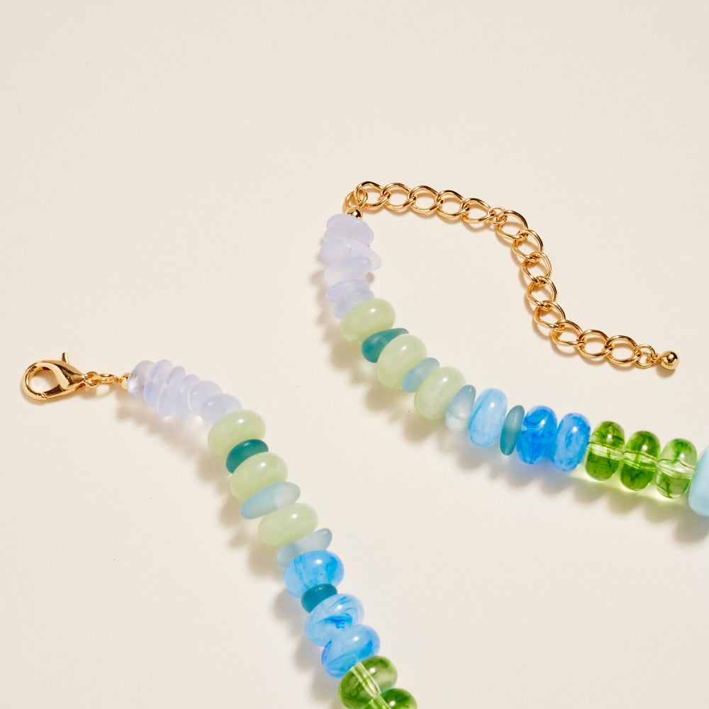 This 16 inch chain necklace features a mix of ombre marbled clear beads and smooth seaglass beads for a soft, coastal inspired look. The blend of translucent and frosted textures adds gentle color and depth. A lightweight, easy wearing piece perfect for warm weather styling.