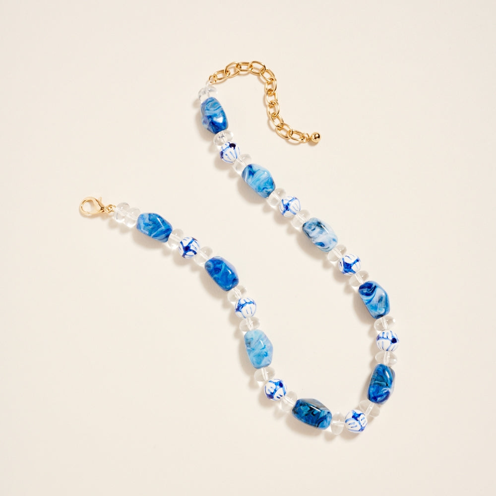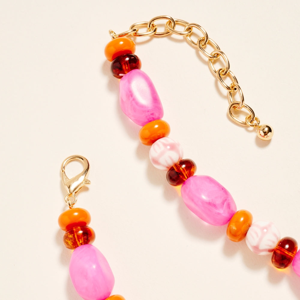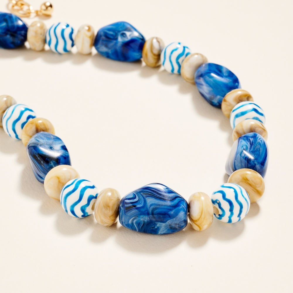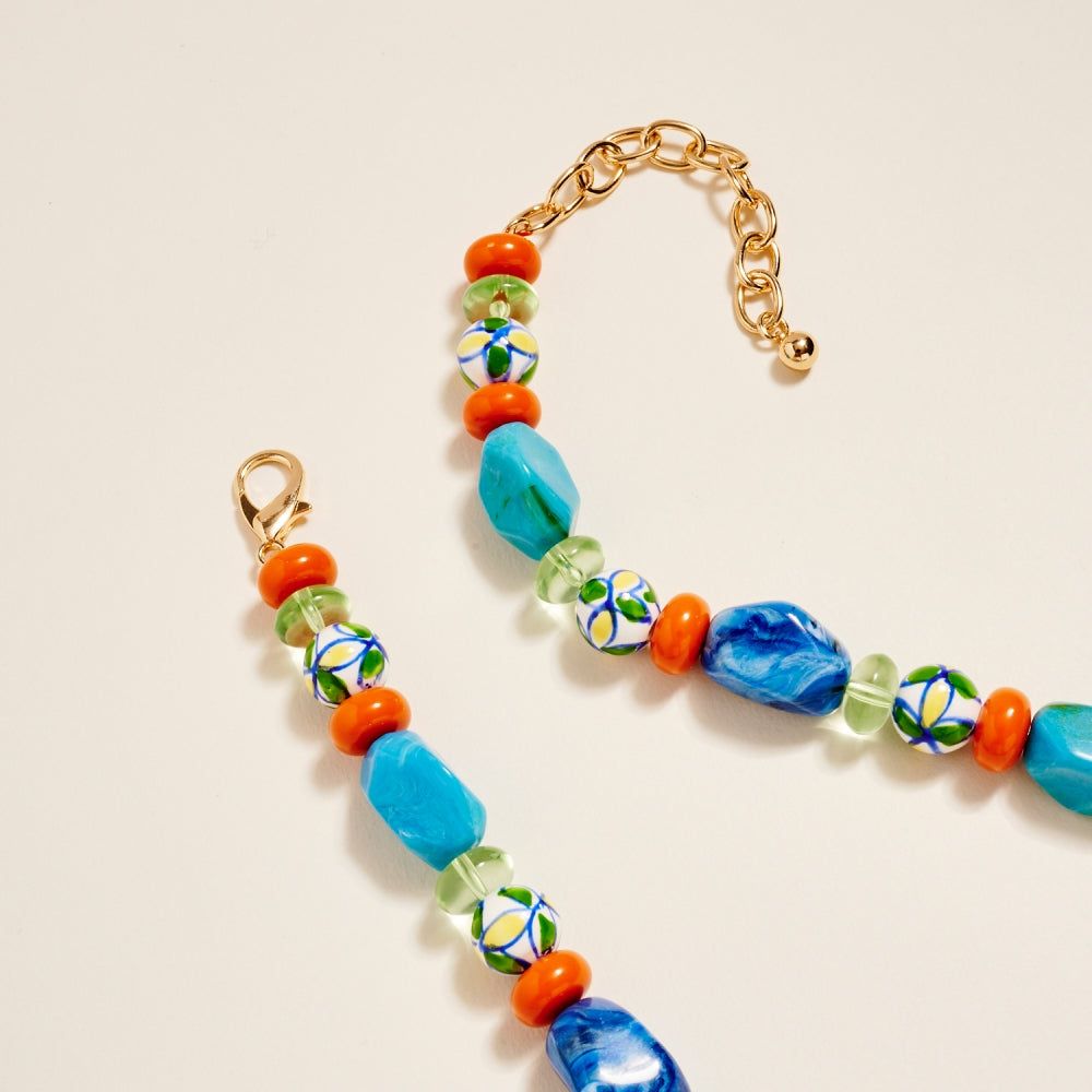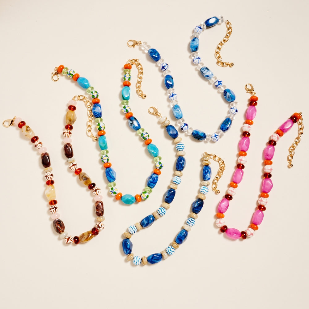 Artful ceramic beads and bold marbled tones come together in this textured beaded chain style. The ombre details and clear bead accents create a soft gradient effect. A creative yet wearable piece for customers who love expressive jewelry.
