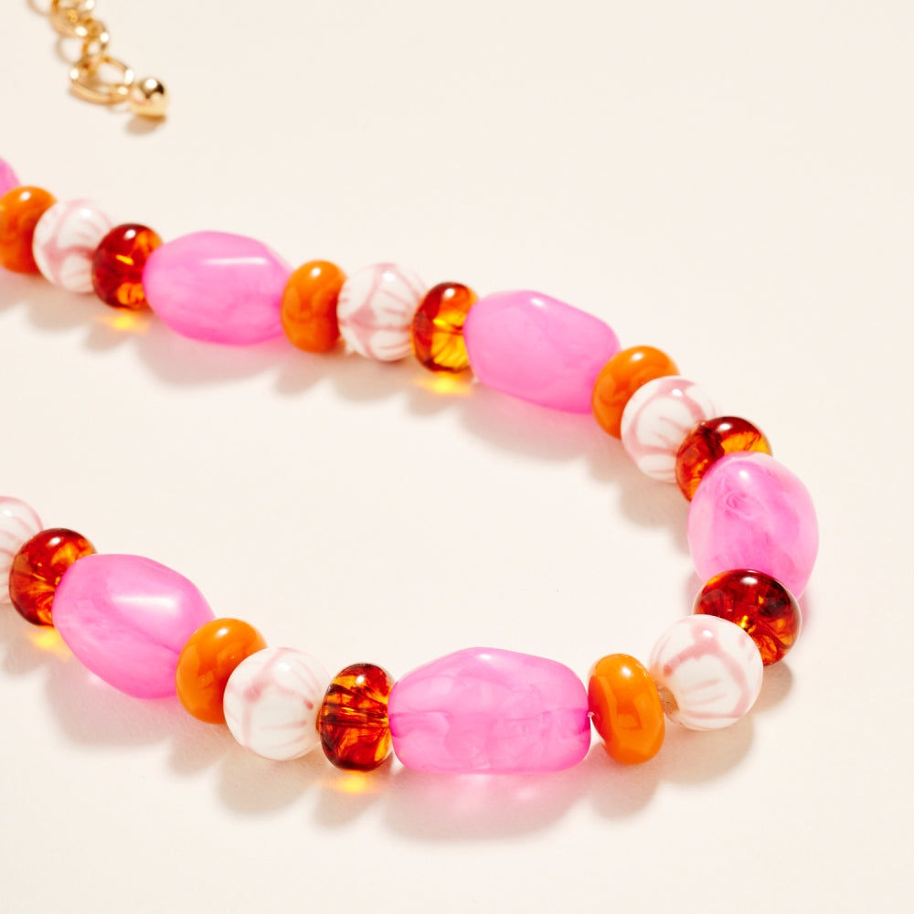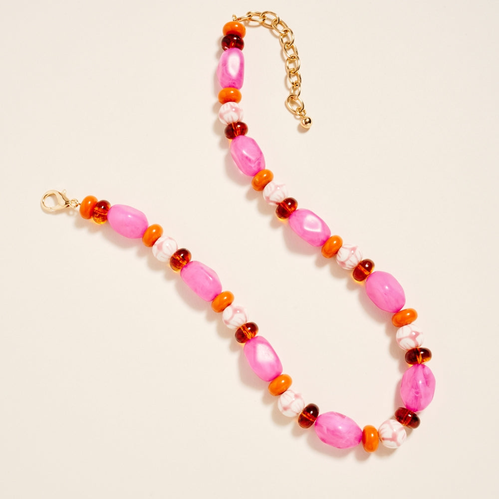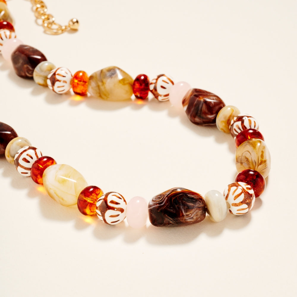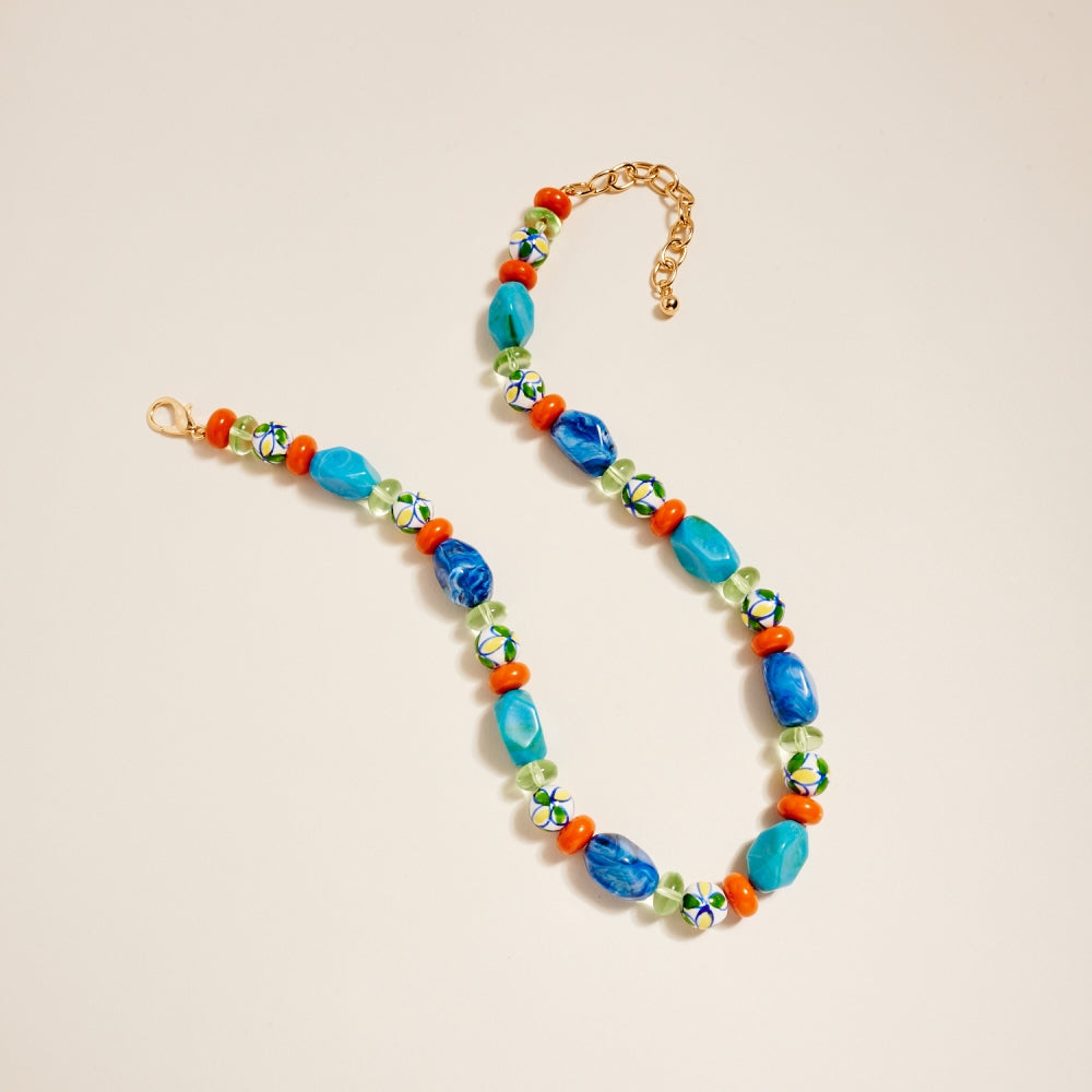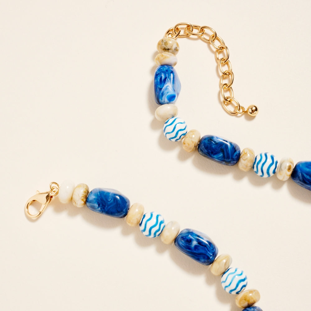 Artful ceramic beads and bold marbled tones come together in this textured beaded chain style. The ombre details and clear bead accents create a soft gradient effect. A creative yet wearable piece for customers who love expressive jewelry.