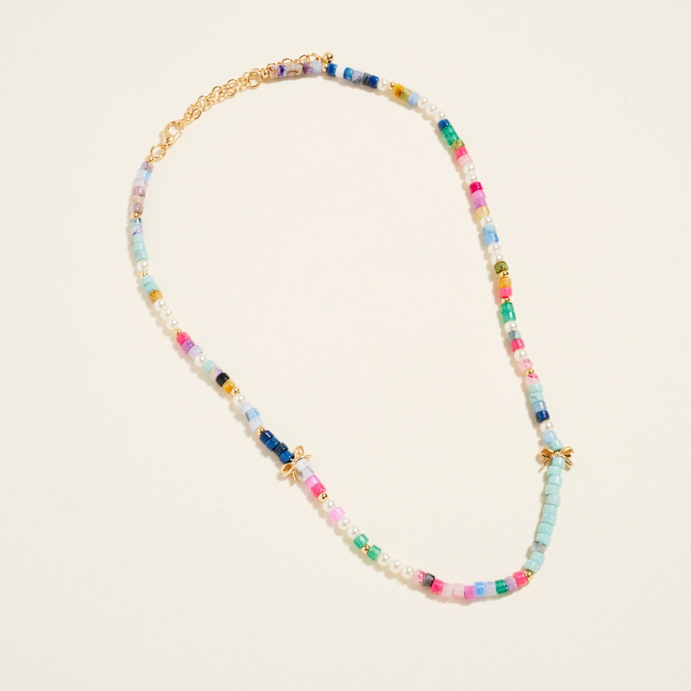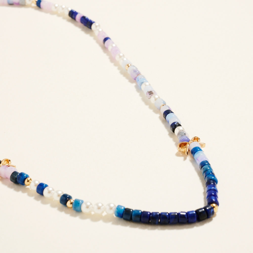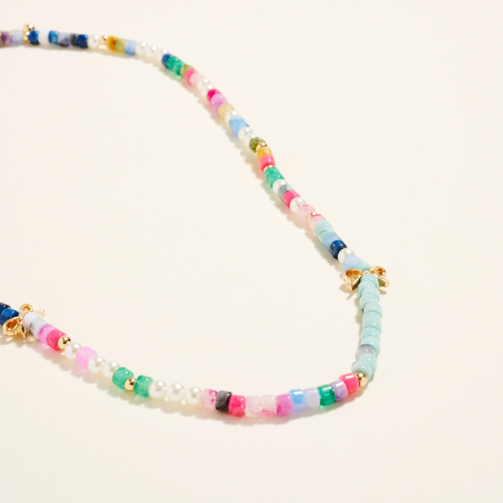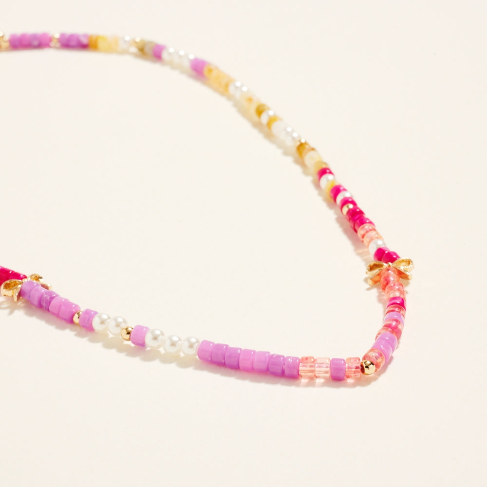 A charming mix of pearl accents and gradient resin beads creates a light and stylish design. Dainty bow charms completes the design with a graceful feminine touch.