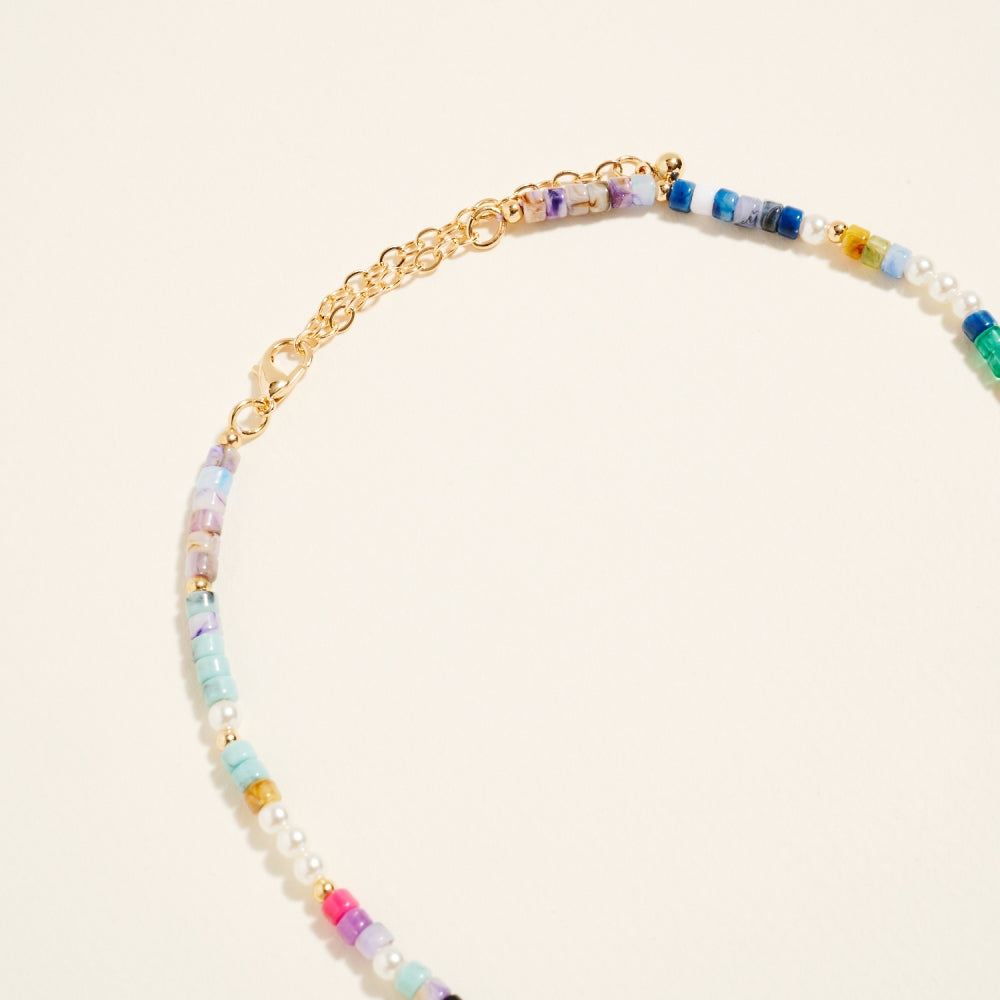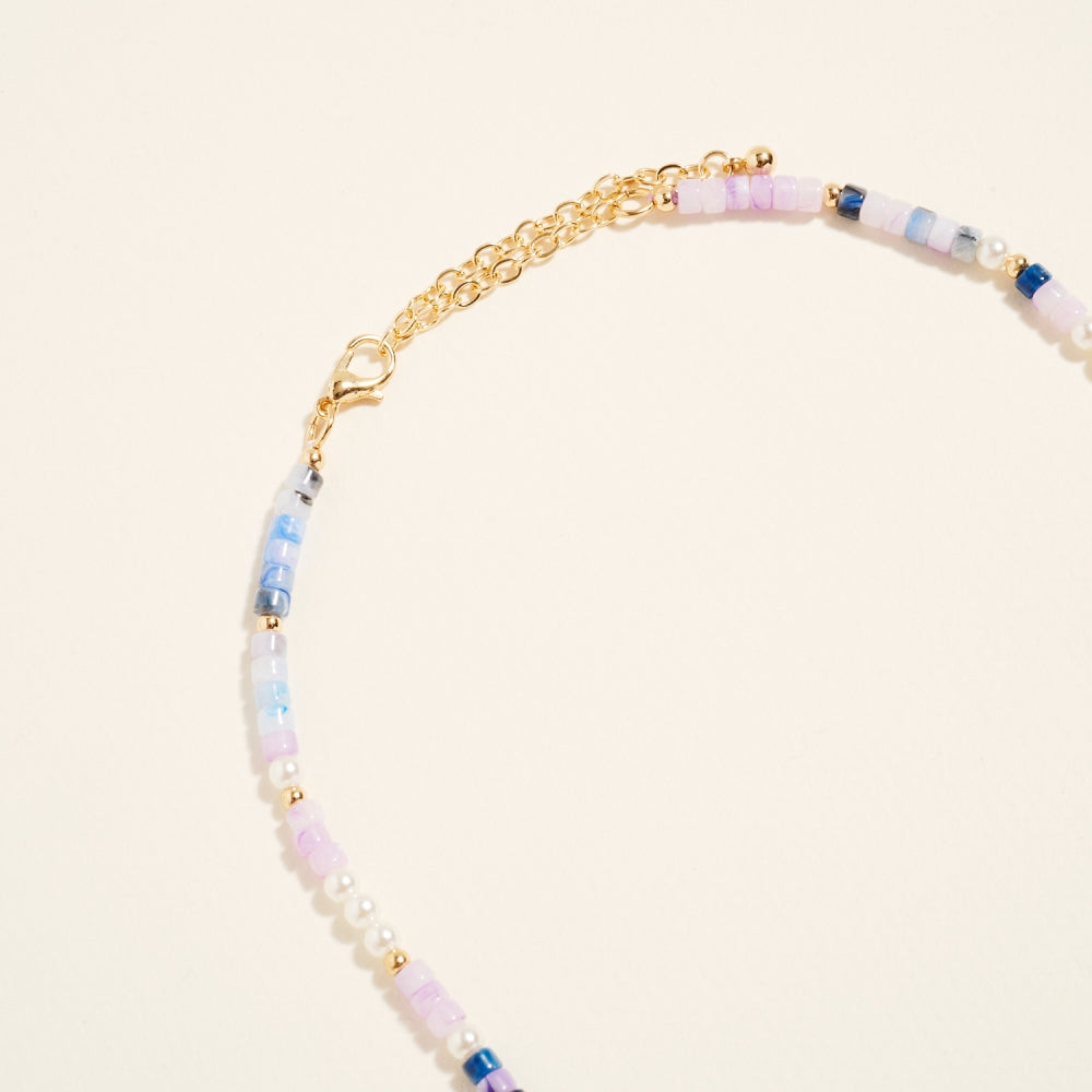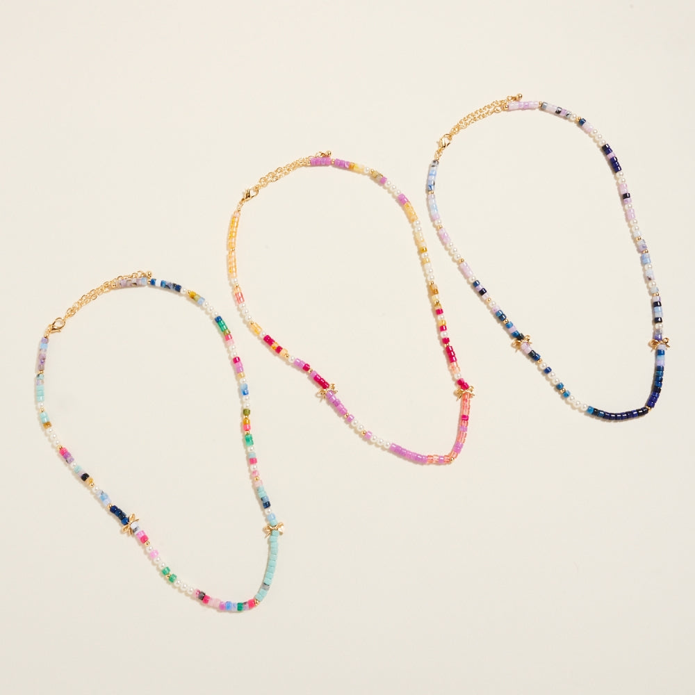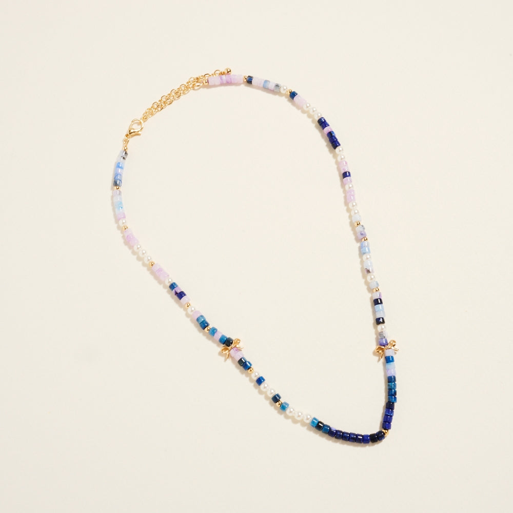 A charming mix of pearl accents and gradient resin beads creates a light and stylish design. Dainty bow charms completes the design with a graceful feminine touch.