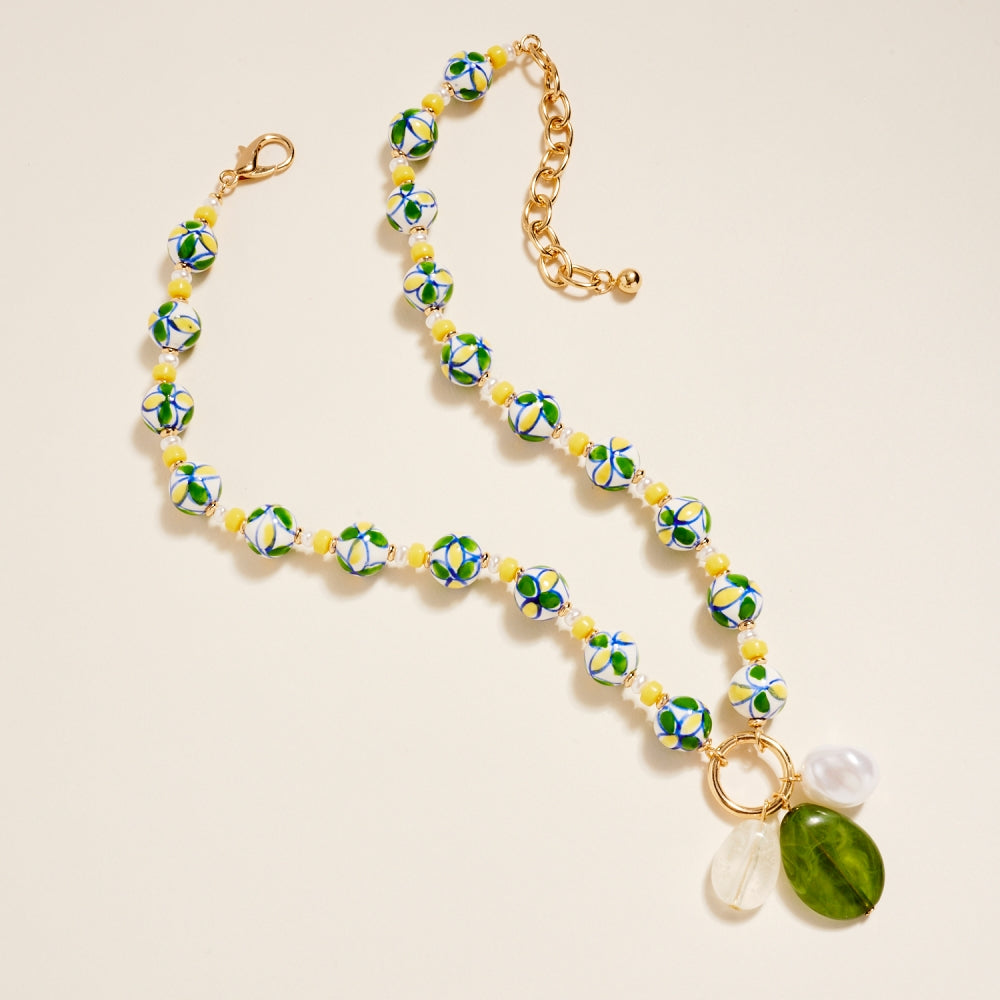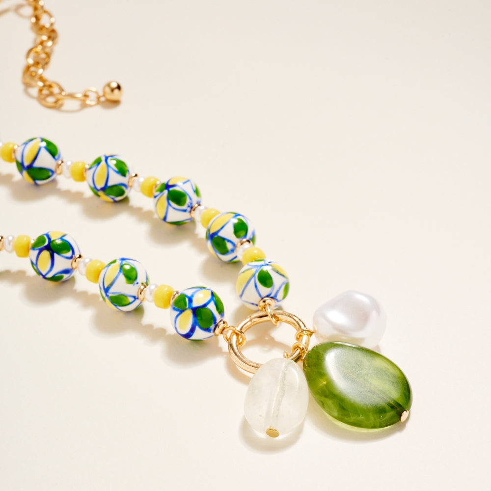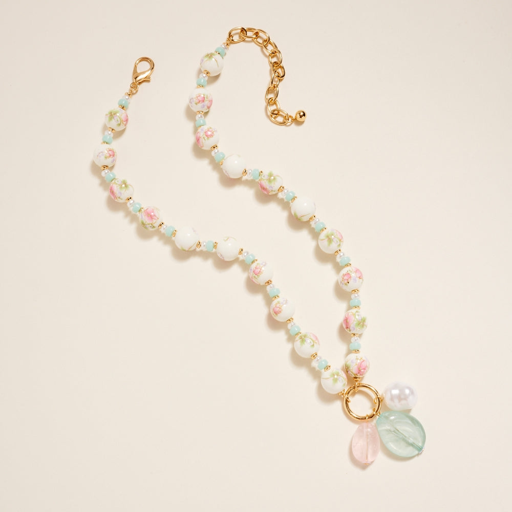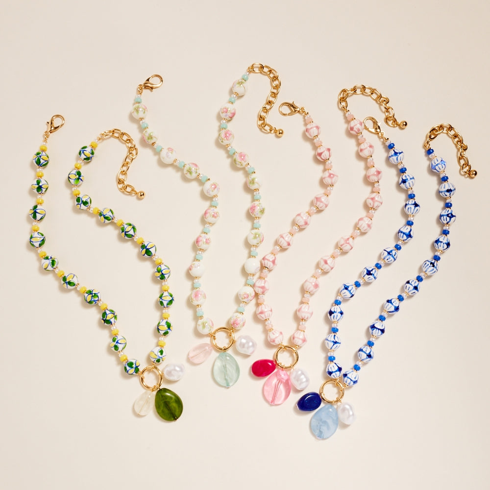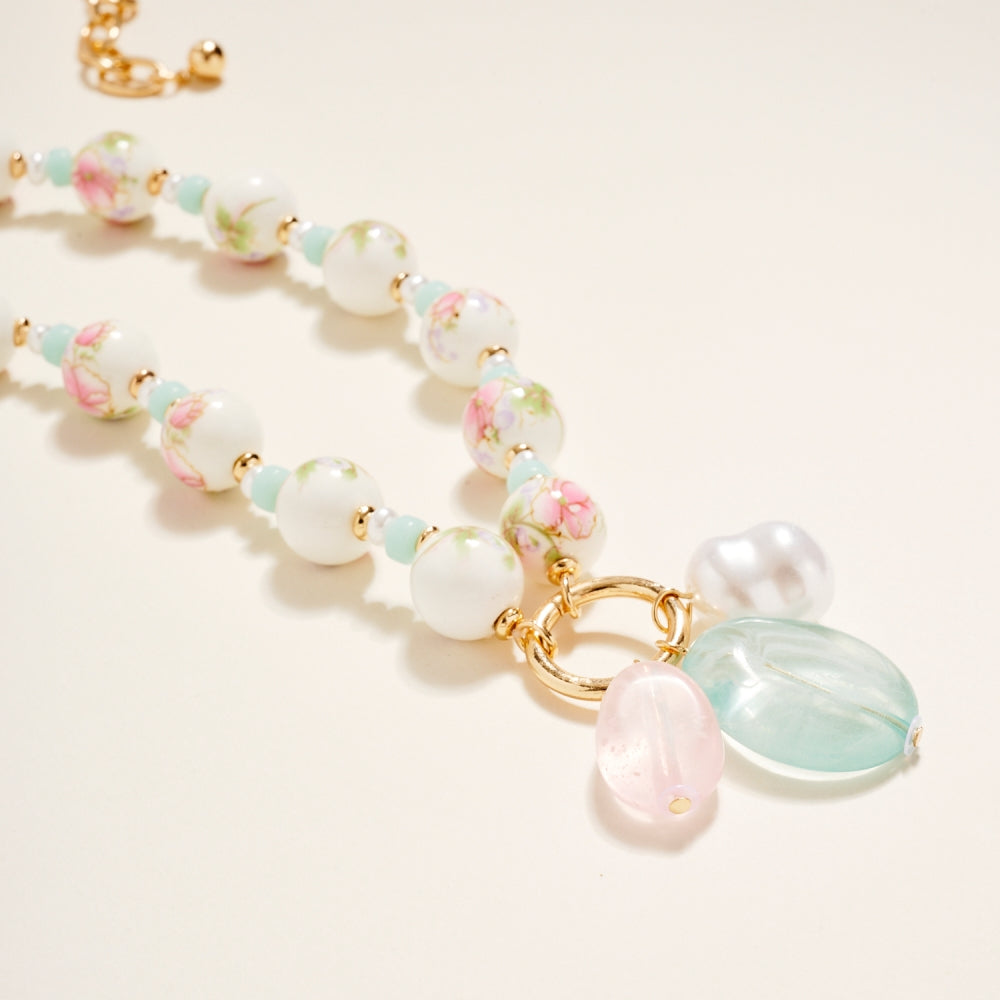 This necklace pairs hand painted ceramic beads with a pendant made of one pearl and two marbled beads for a simple yet distinctive look. The combination gives the design a natural and timeless style.