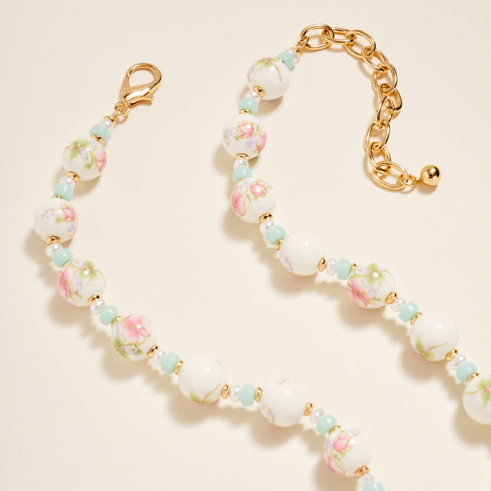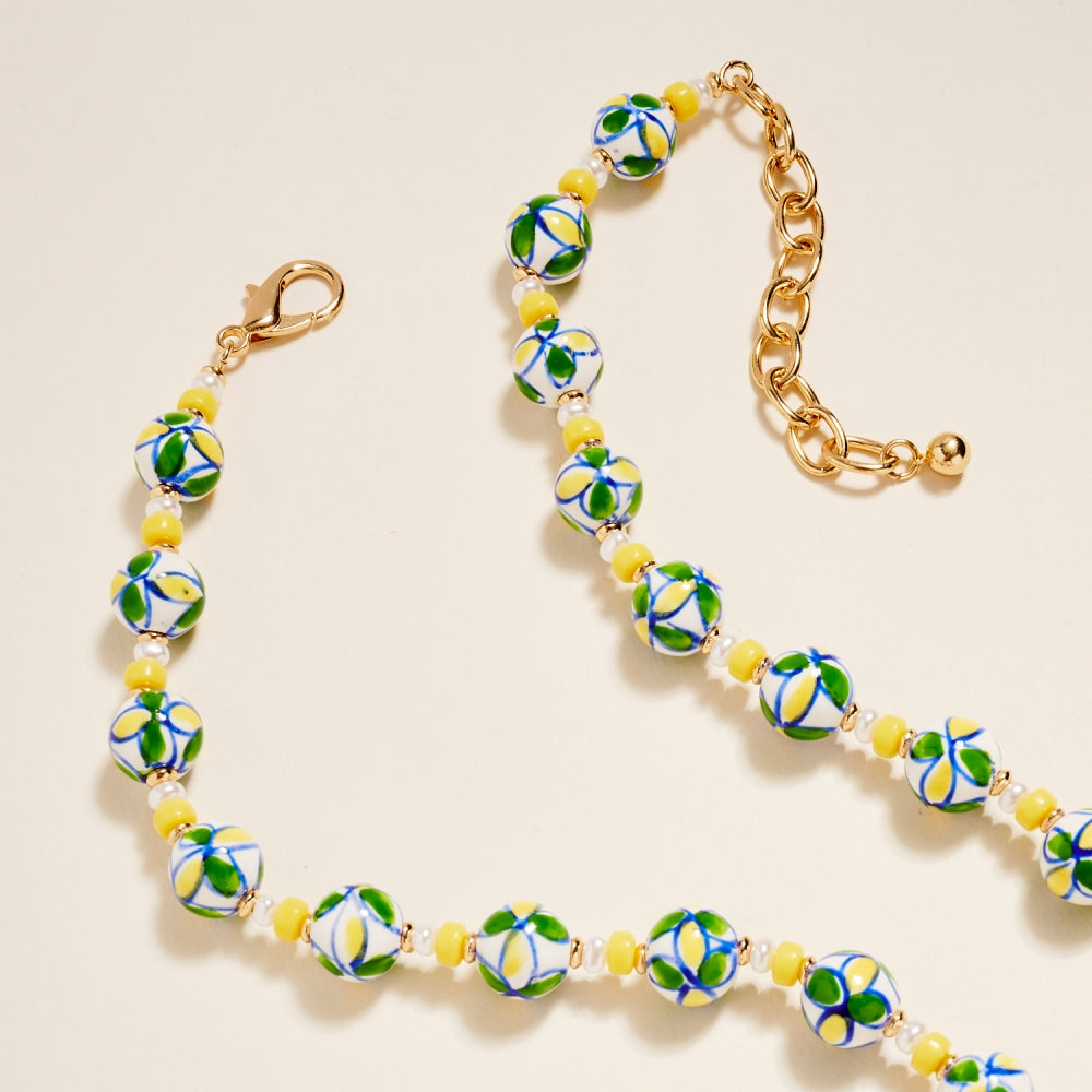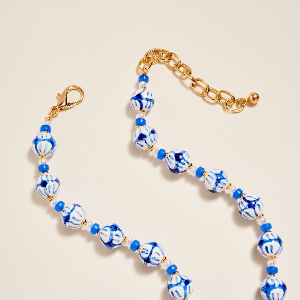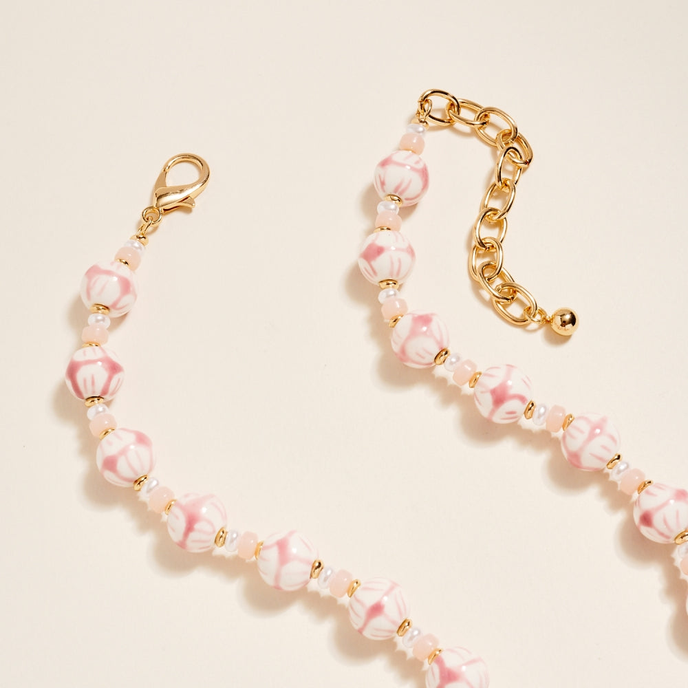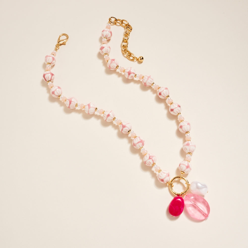 This necklace pairs hand painted ceramic beads with a pendant made of one pearl and two marbled beads for a simple yet distinctive look. The combination gives the design a natural and timeless style.
