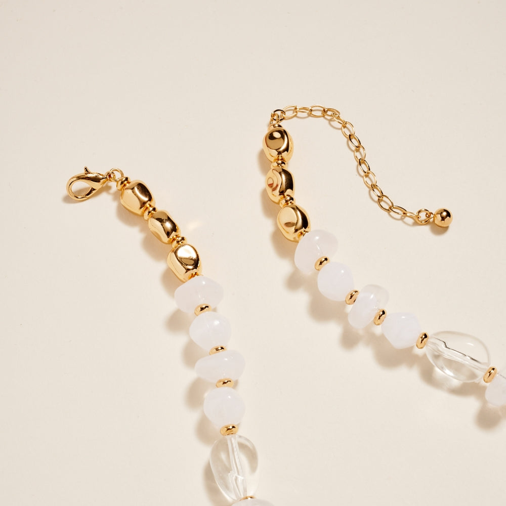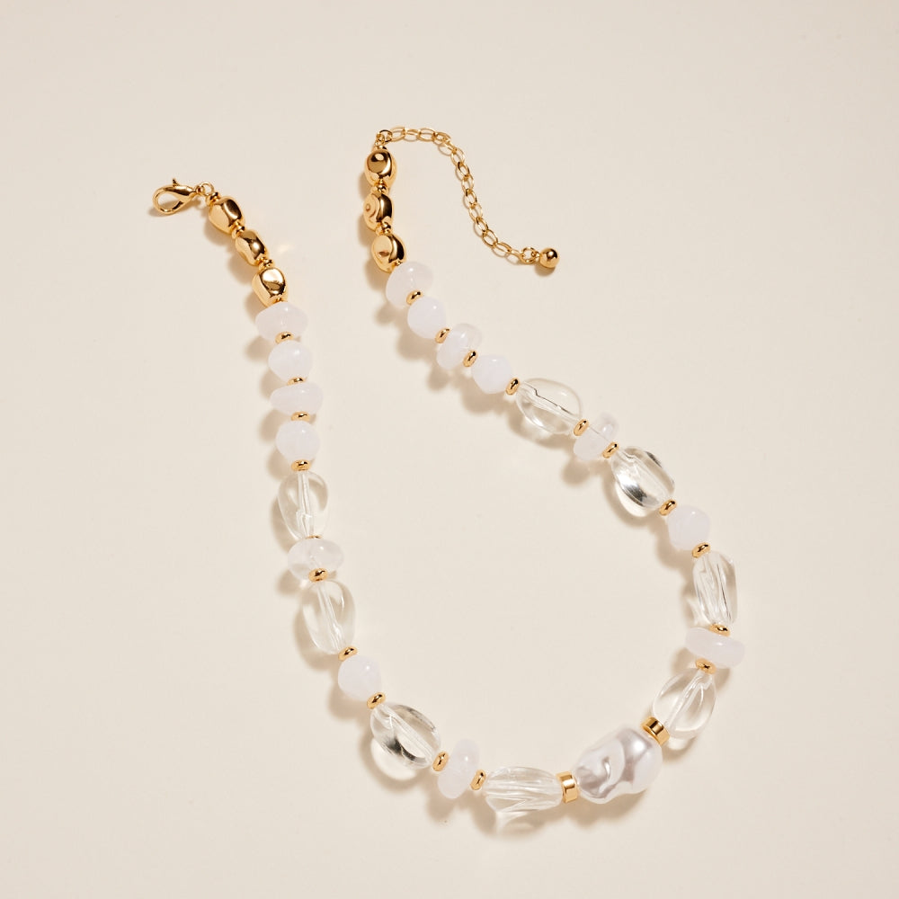 This 18 inch chain necklace blends clear and marbled resin beads with metallic accents for a modern, dimensional look. A single pearl pendant adds a classic touch that softens the mixed materials. An effortless statement piece that works beautifully alone or layered.