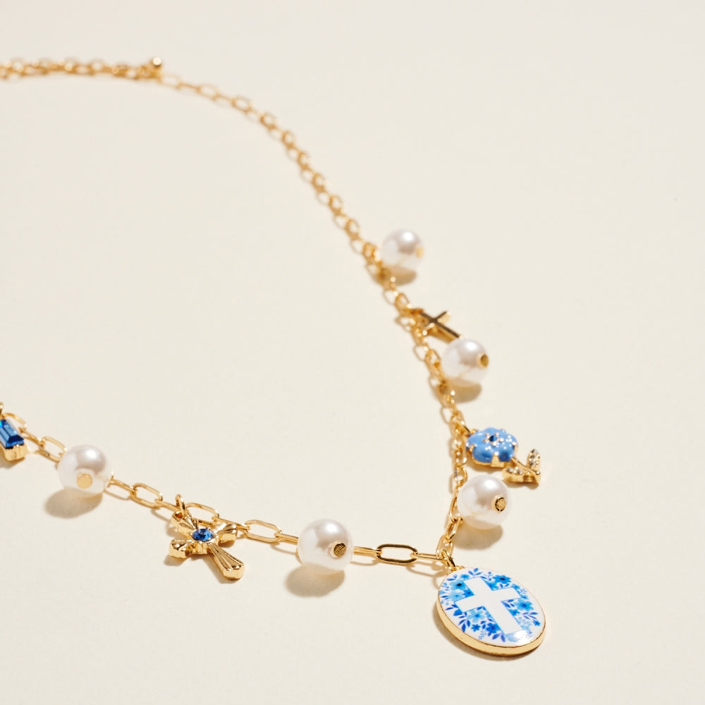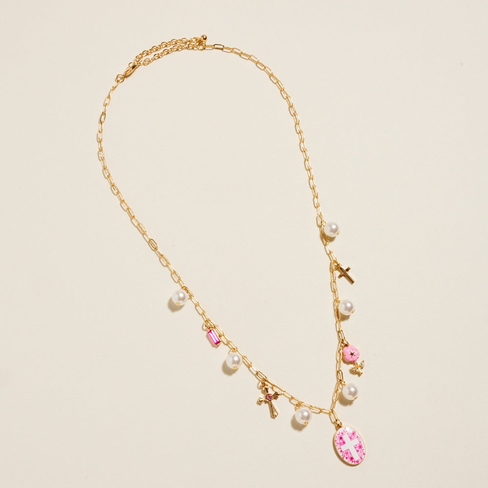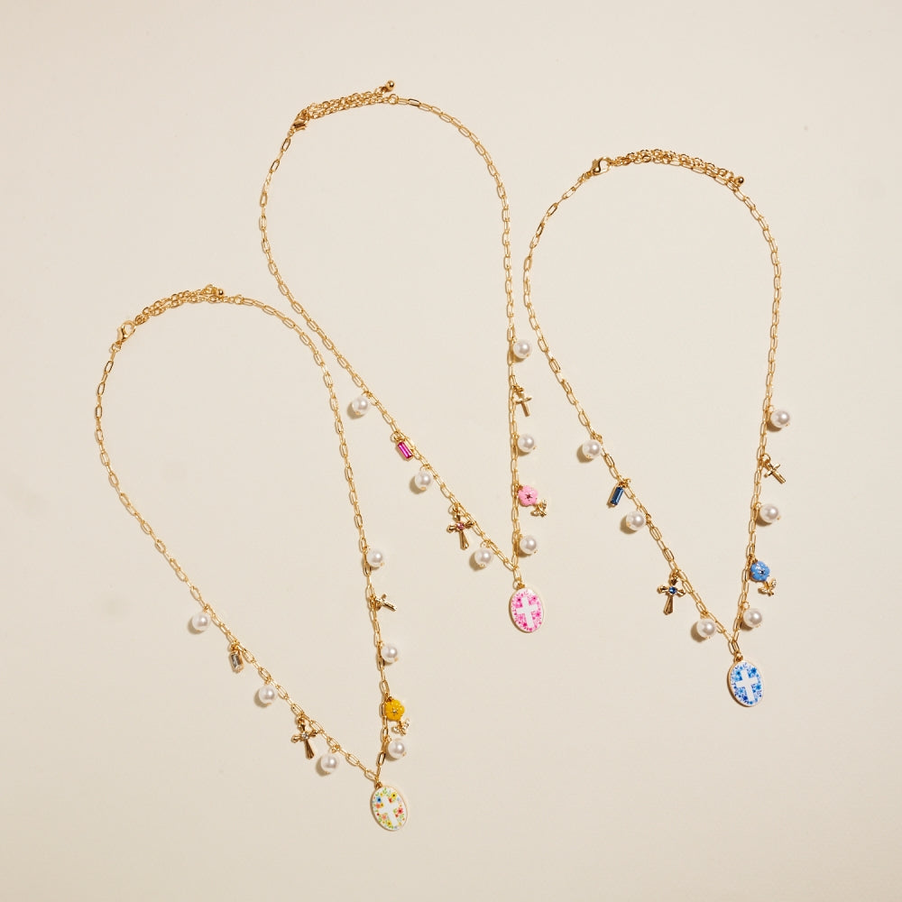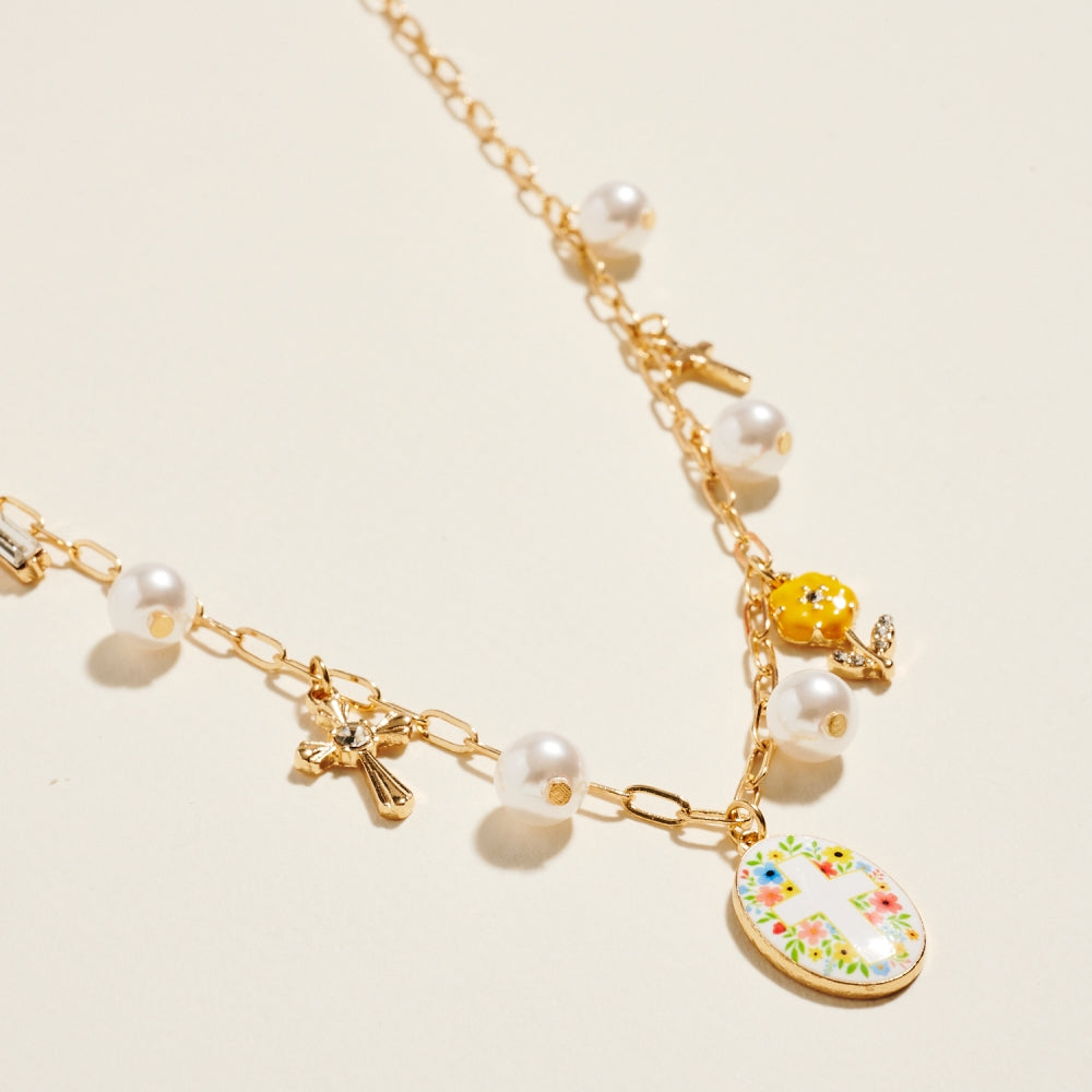 A delicate mix of faith and floral charm, this necklace features an enamel cross pendant paired with pearl and rhinestone accents. The layered charms bring a touch of sparkle and softness to everyday styling. An easy go-to piece for meaningful accessorizing.