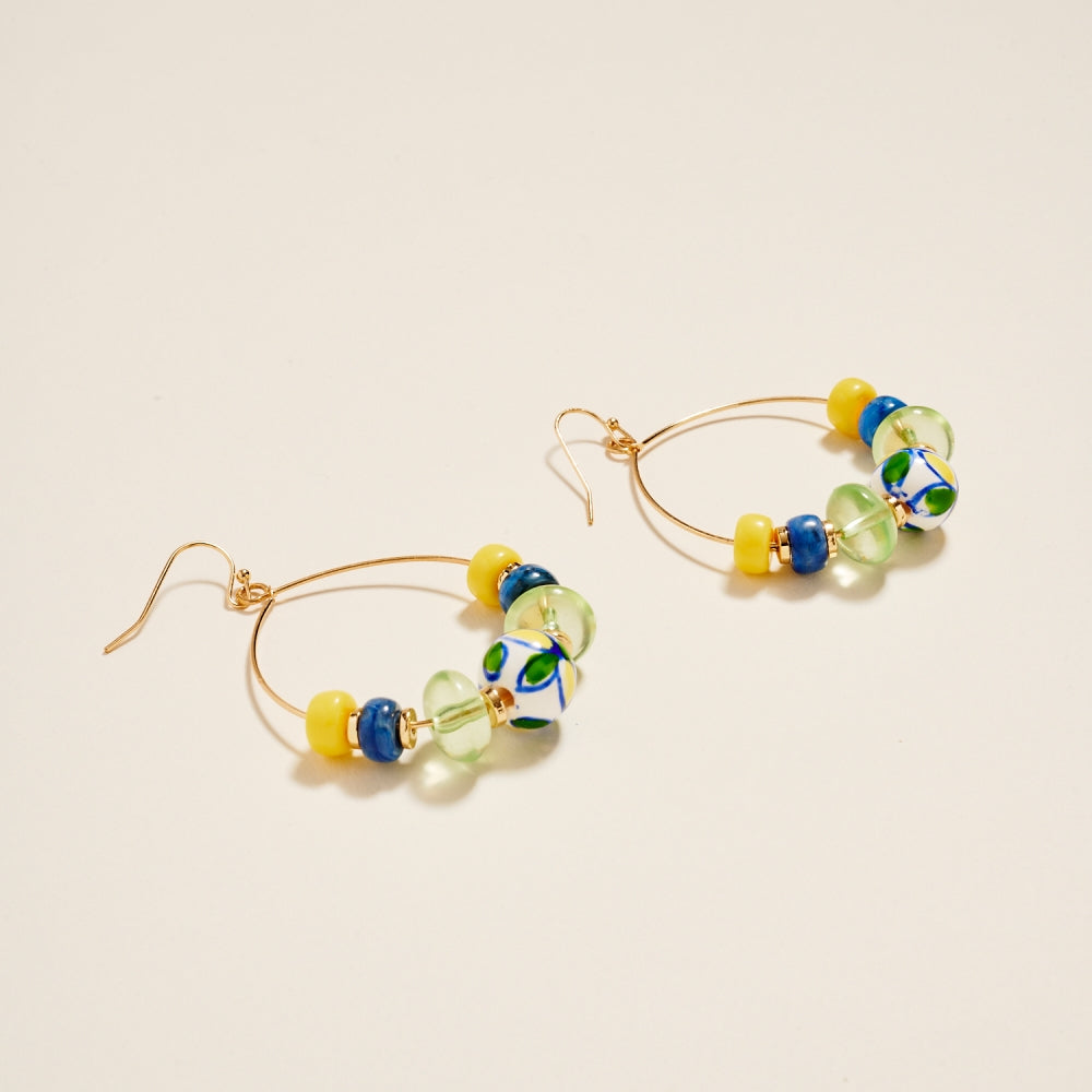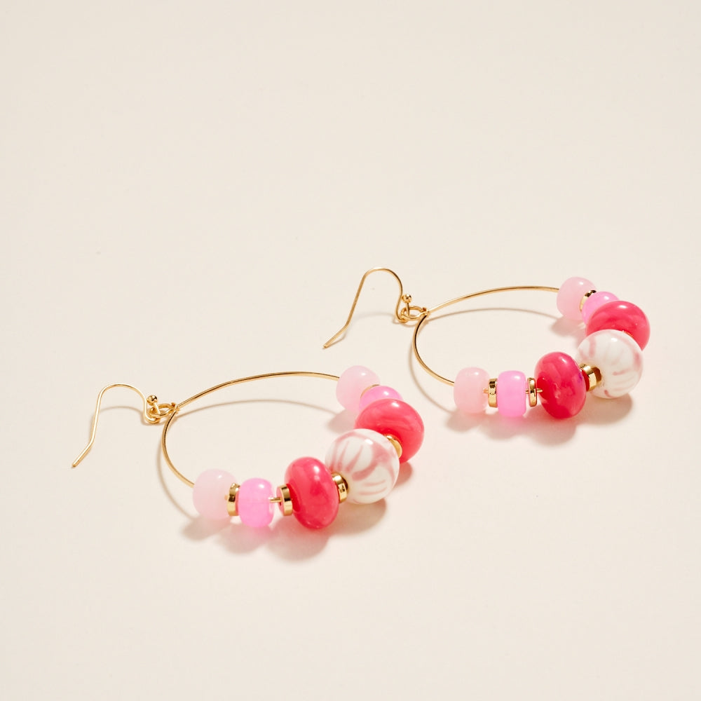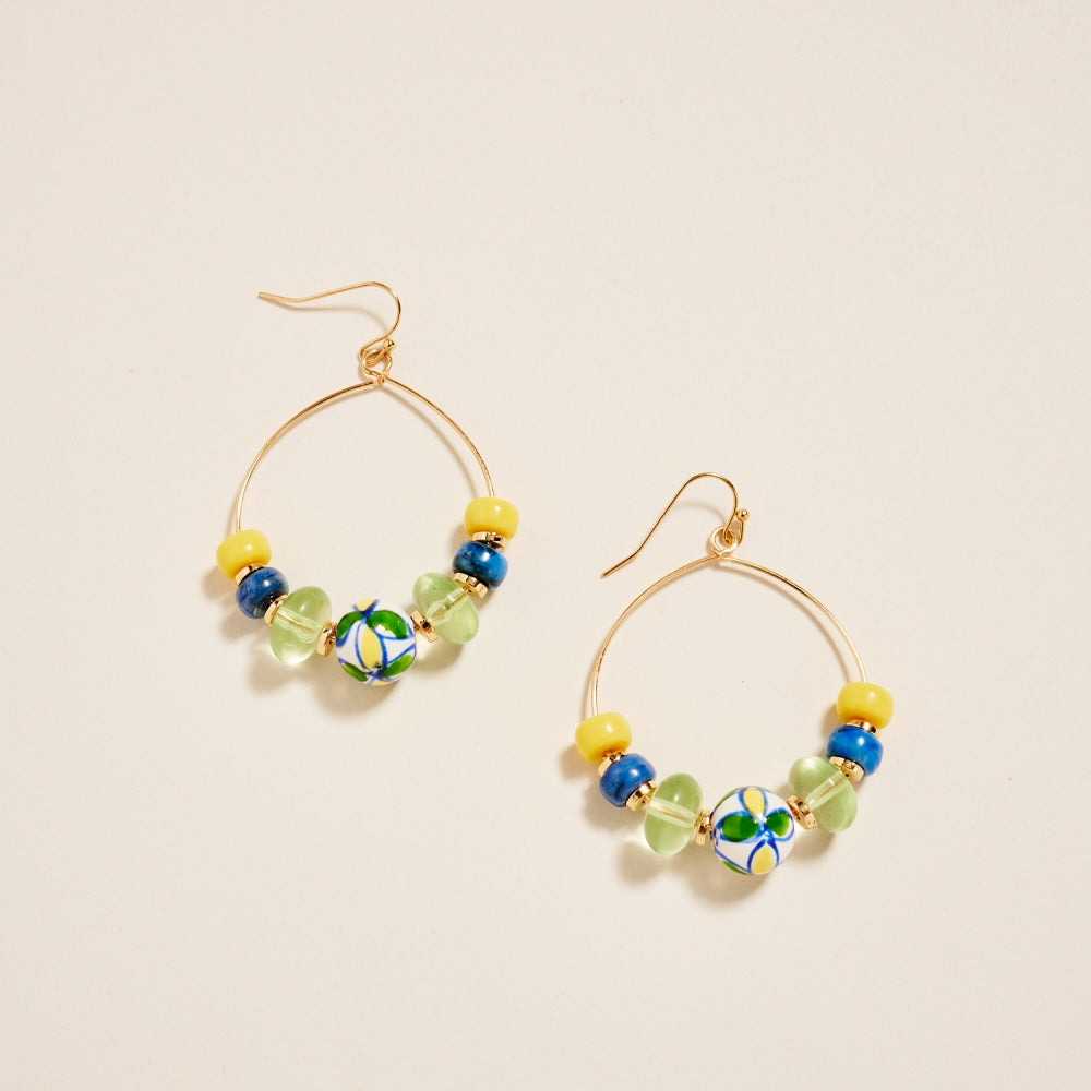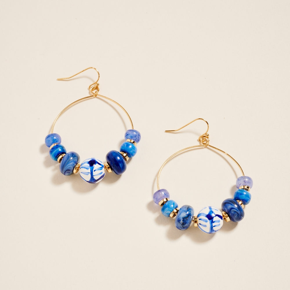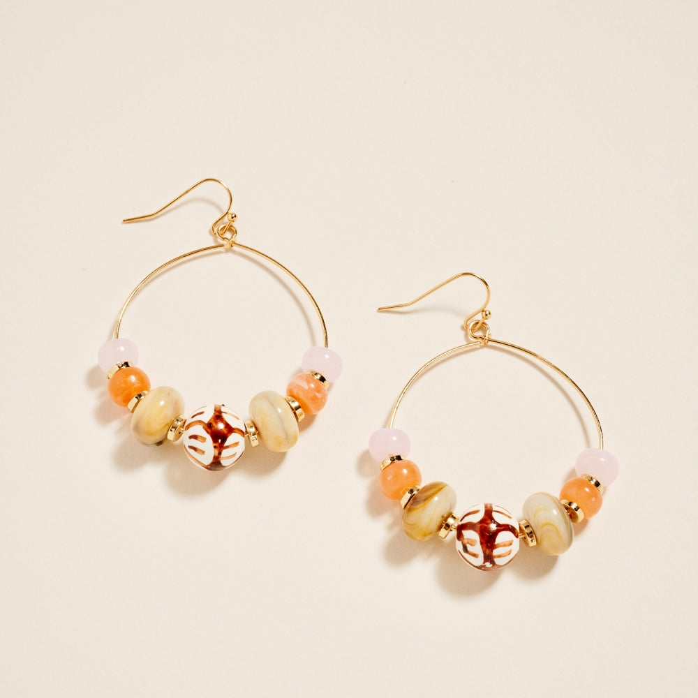 Crafted with marbled beads surrounding a hand painted ceramic centerpiece, this 2.25 inch hoop offers a charming handcrafted look. The hook style adds gentle movement and comfort. A balanced mix of color and texture for everyday styling.