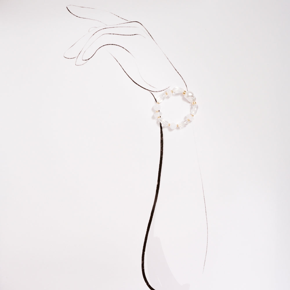 This bracelet mixes clear resin beads with polished metal disks for a bold yet modern look. The irregular natural sized pearl pendant adds a soft, organic touch to the chunky silhouette. A versatile statement piece that elevates everyday wear and pairs beautifully with layered jewelry.