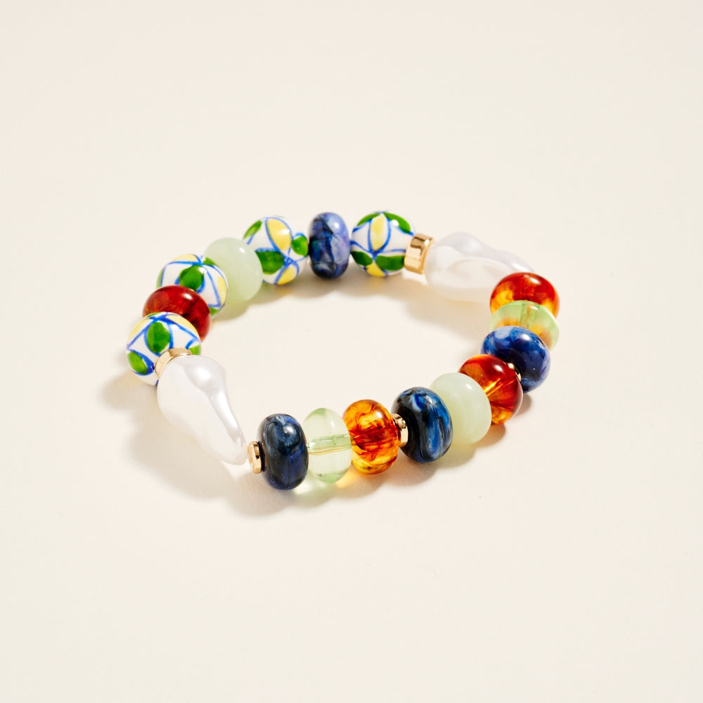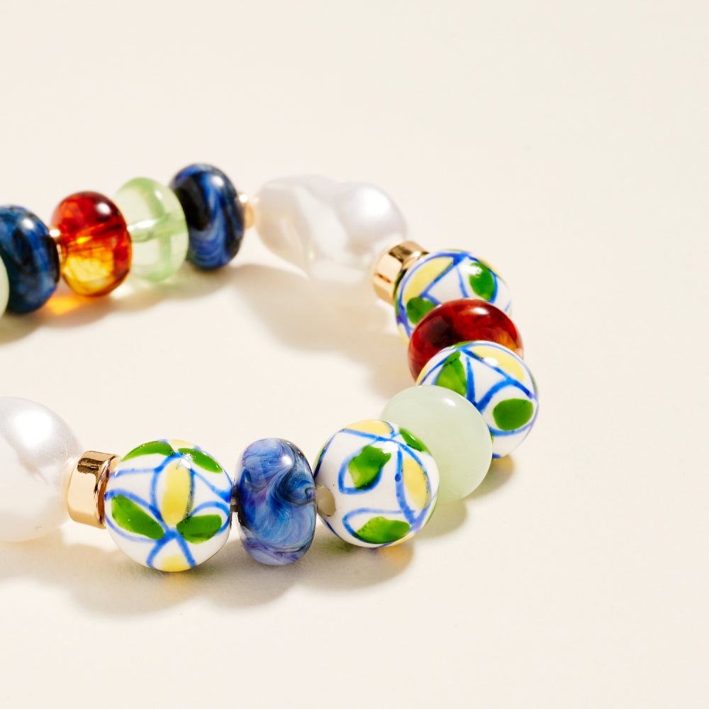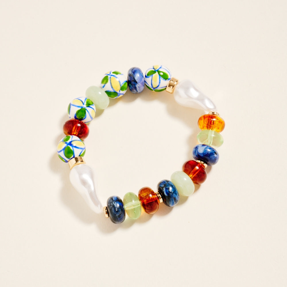 Hand painted ceramic beads pair beautifully with clear marbled disk beads in this 7.25 inch bracelet. Metal disks add texture while natural sized pearls bring a classic touch. The stretch fit offers effortless styling for daily use.