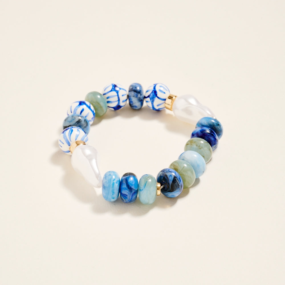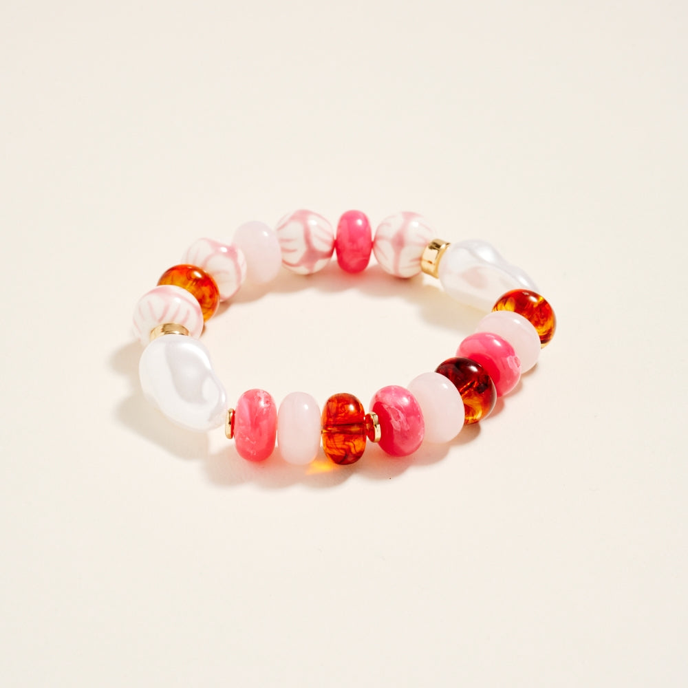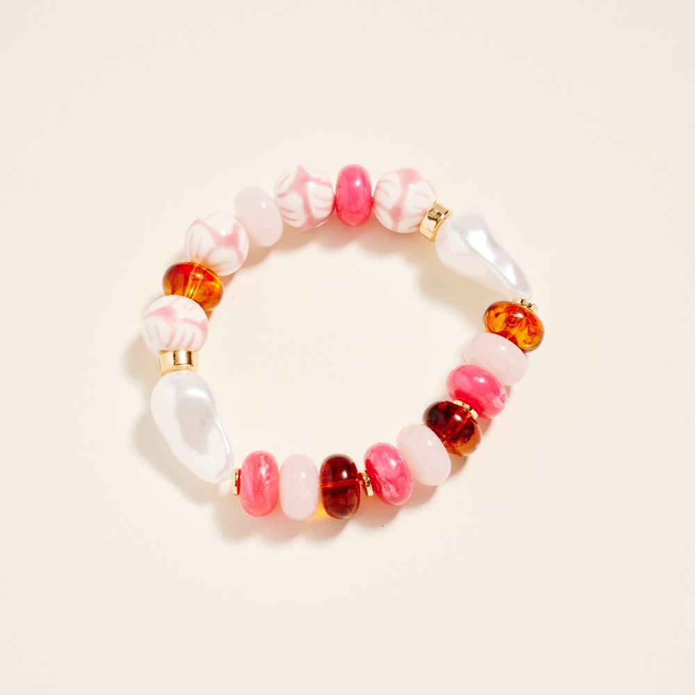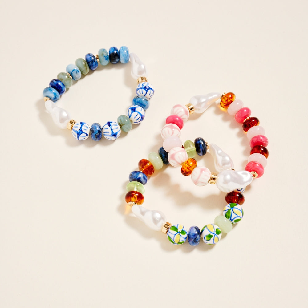 Hand painted ceramic beads pair beautifully with clear marbled disk beads in this 7.25 inch bracelet. Metal disks add texture while natural sized pearls bring a classic touch. The stretch fit offers effortless styling for daily use.