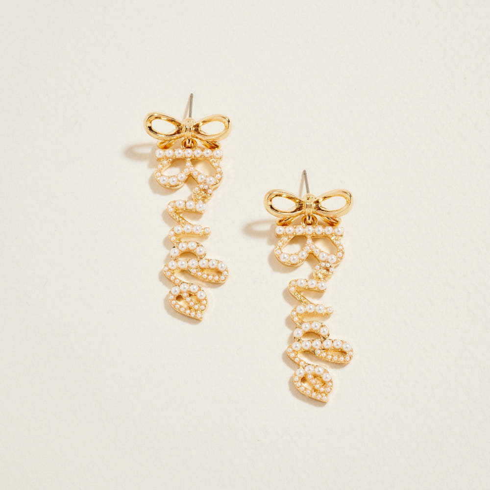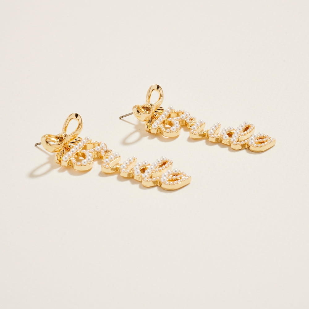 Celebrate love and elegance with these ribbon bow earrings featuring the word Bride delicately engraved and accented with pearl details. A lovely way to add a meaningful sparkle to wedding celebrations.