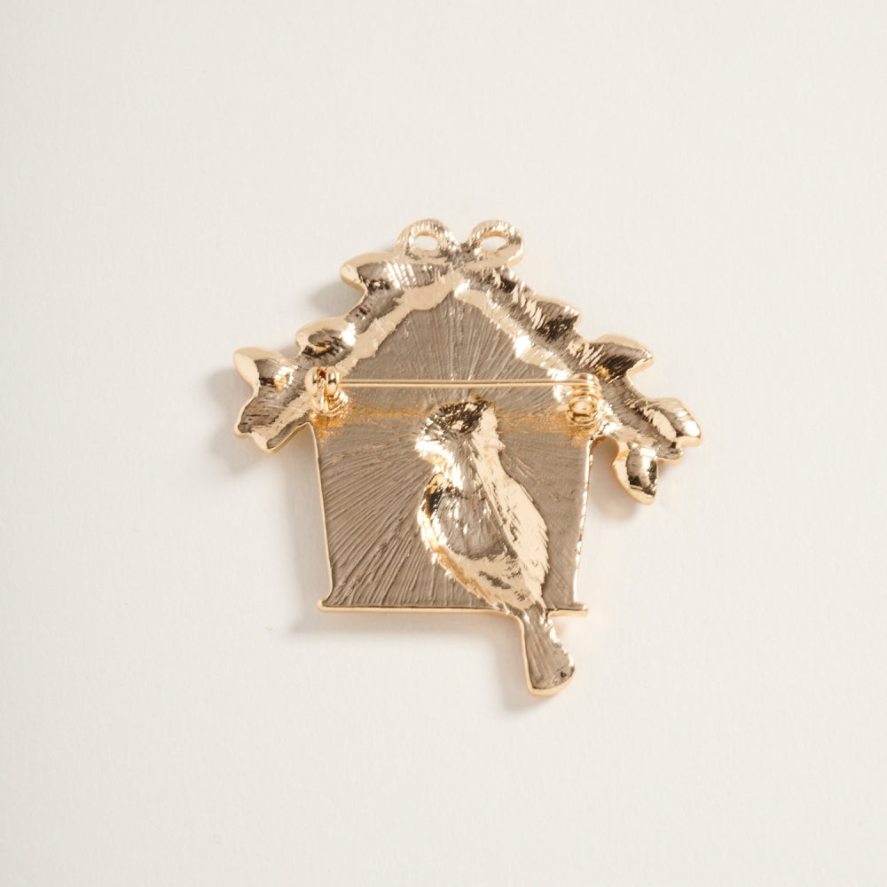 Celebrate winter charm with a cozy cardinal house brooch accented by sparkling rhinestones for a festive look.