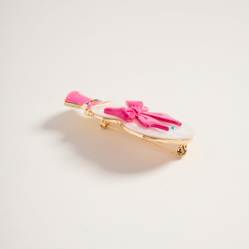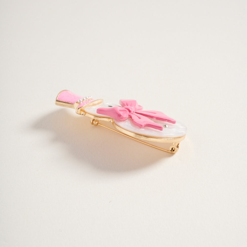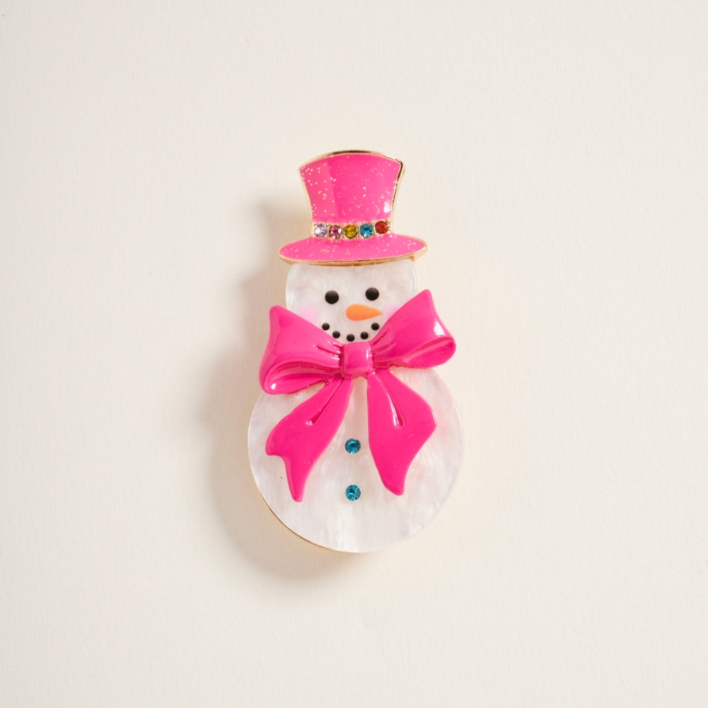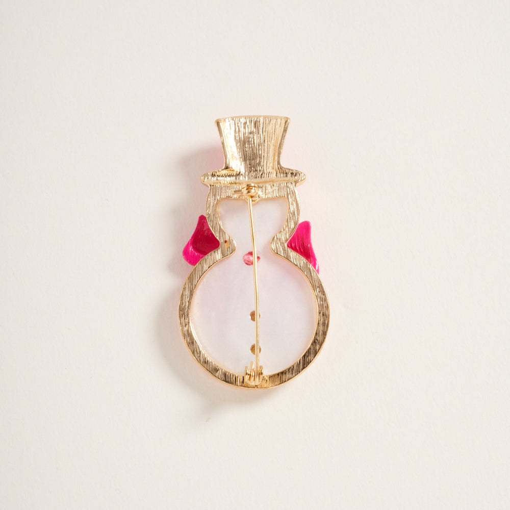 Add a playful pop of holiday spirit with a snowman brooch dressed in a colorful bow, ideal for any festive look.