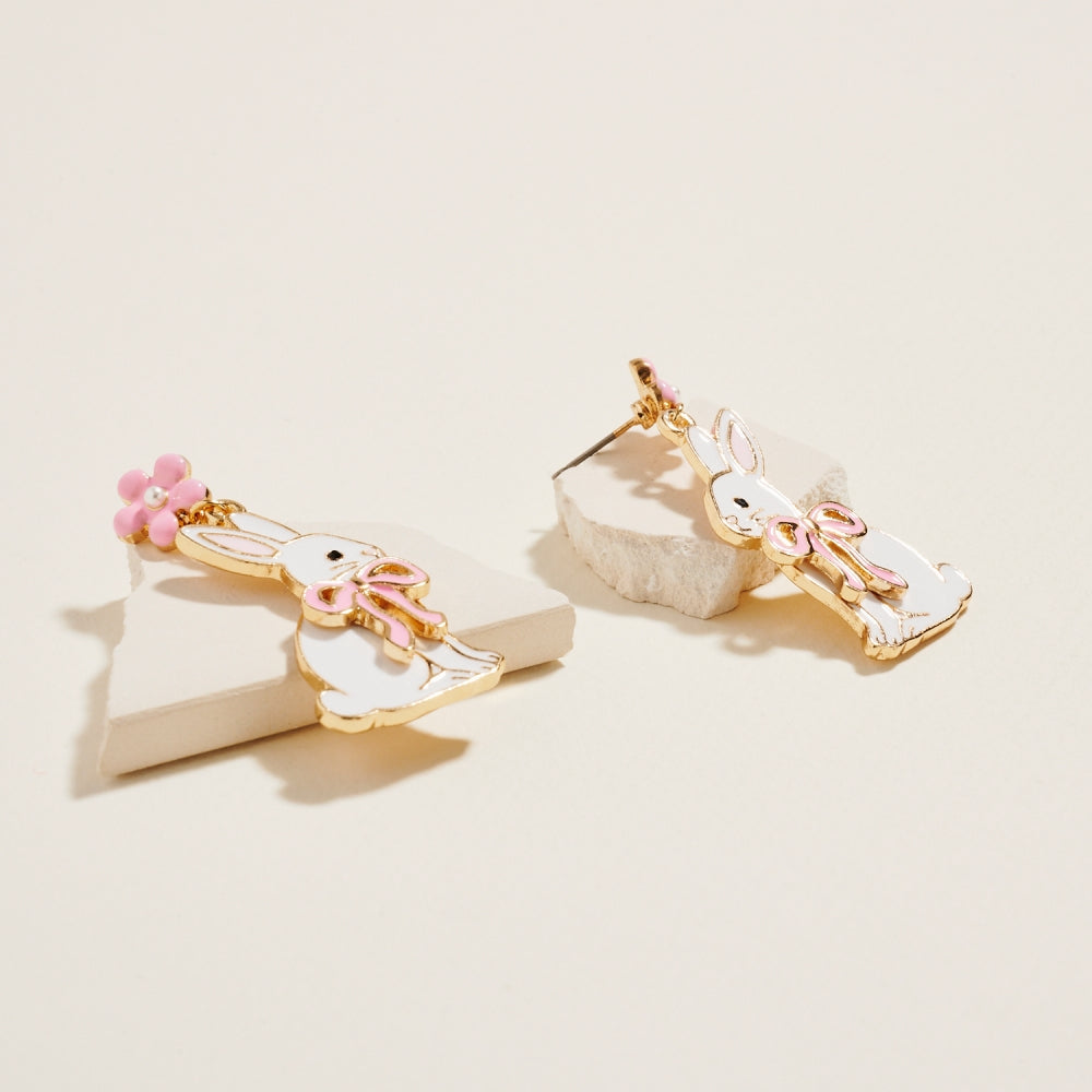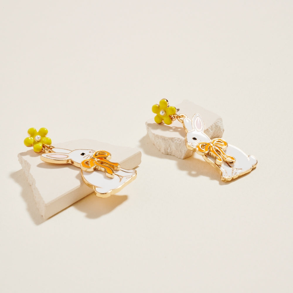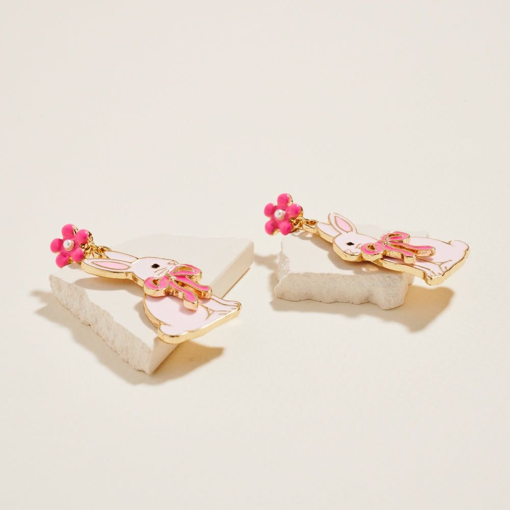 These charming bunny earrings feature a floral enamel design with a petite bow, gently dangling from a delicate flower post accented by a small pearl. Sweet and playful, they add the perfect touch of whimsy to Easter outfits and spring celebrations.