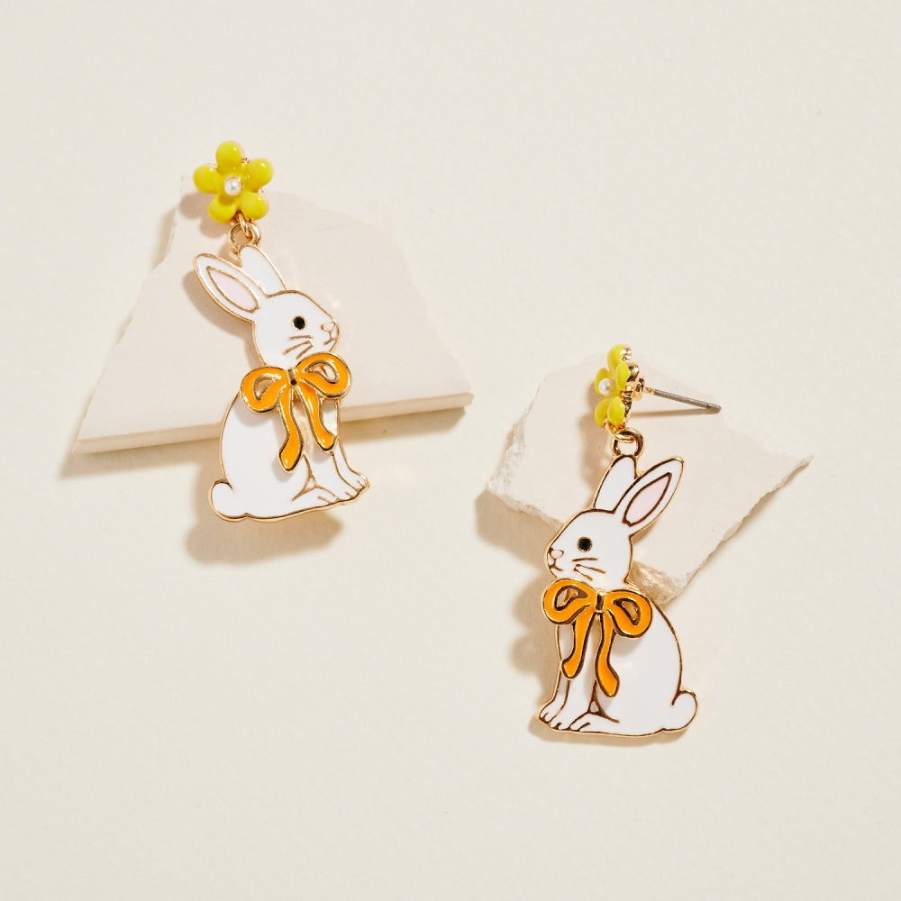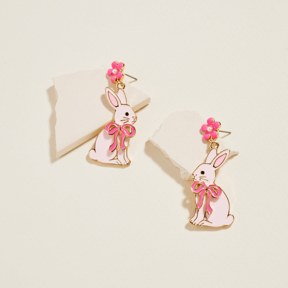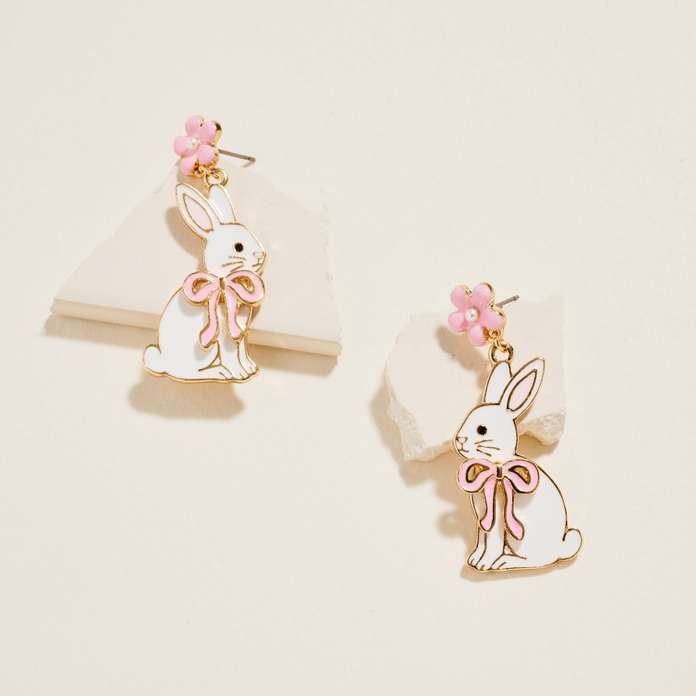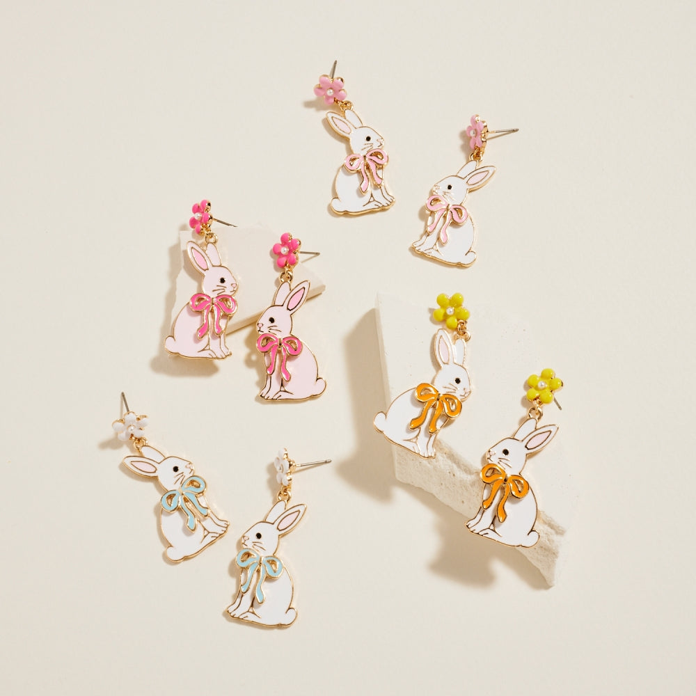 These charming bunny earrings feature a floral enamel design with a petite bow, gently dangling from a delicate flower post accented by a small pearl. Sweet and playful, they add the perfect touch of whimsy to Easter outfits and spring celebrations.