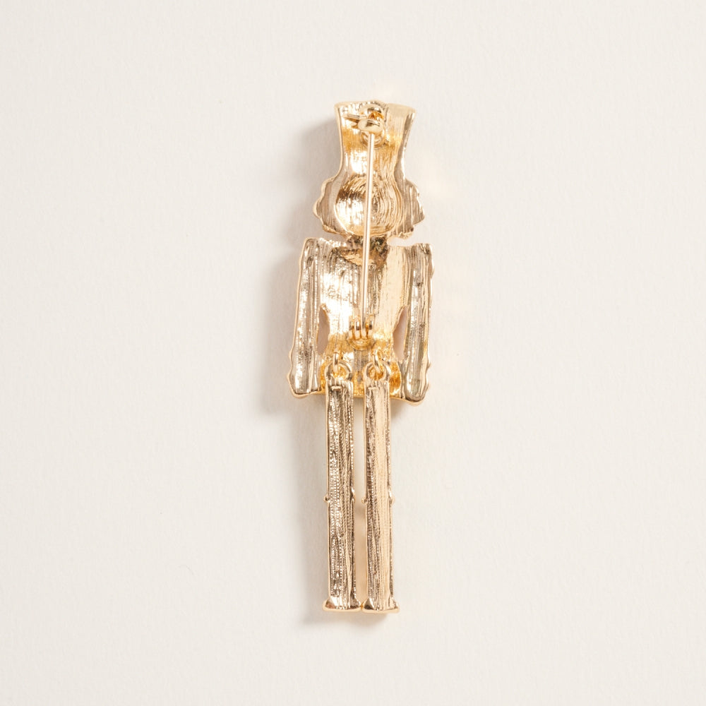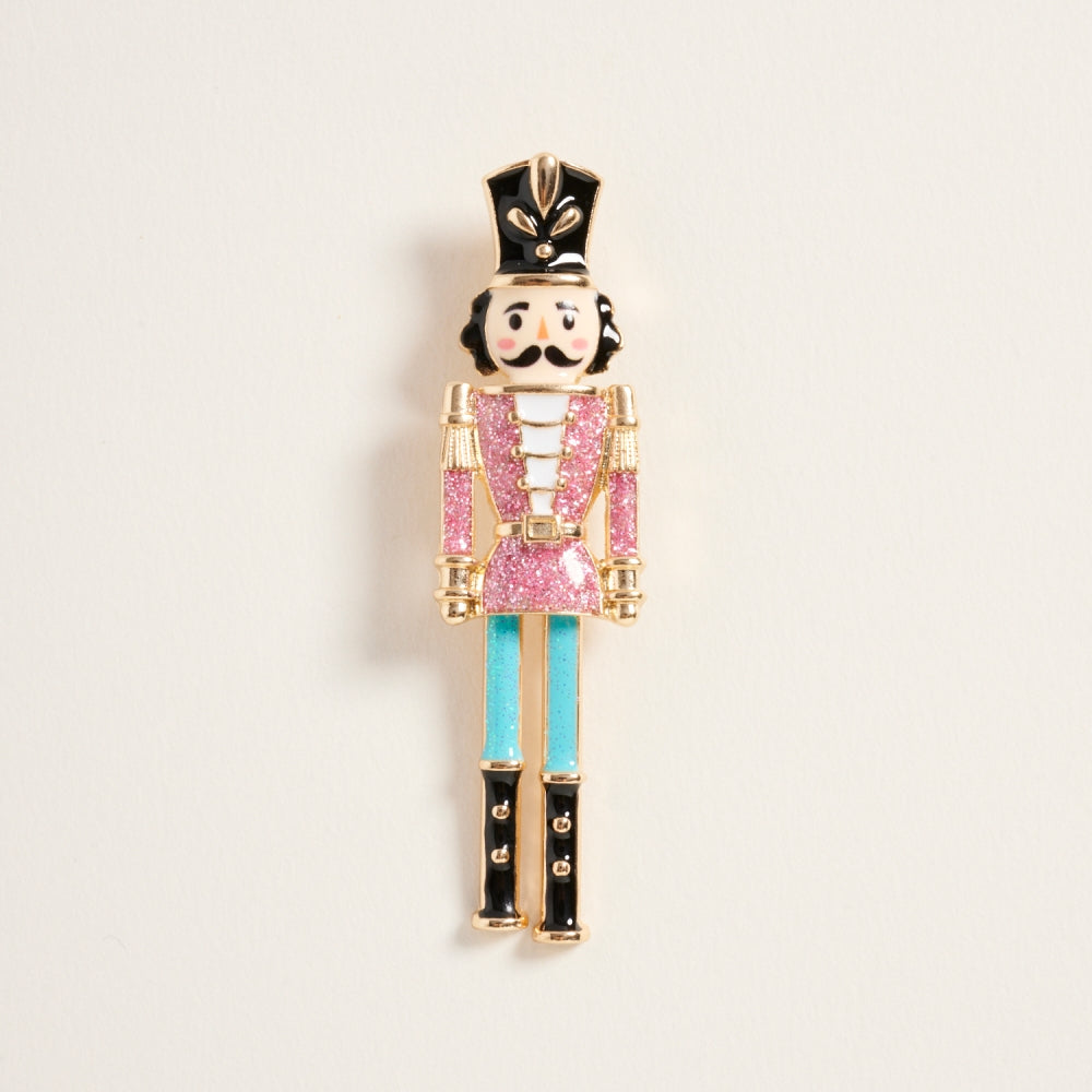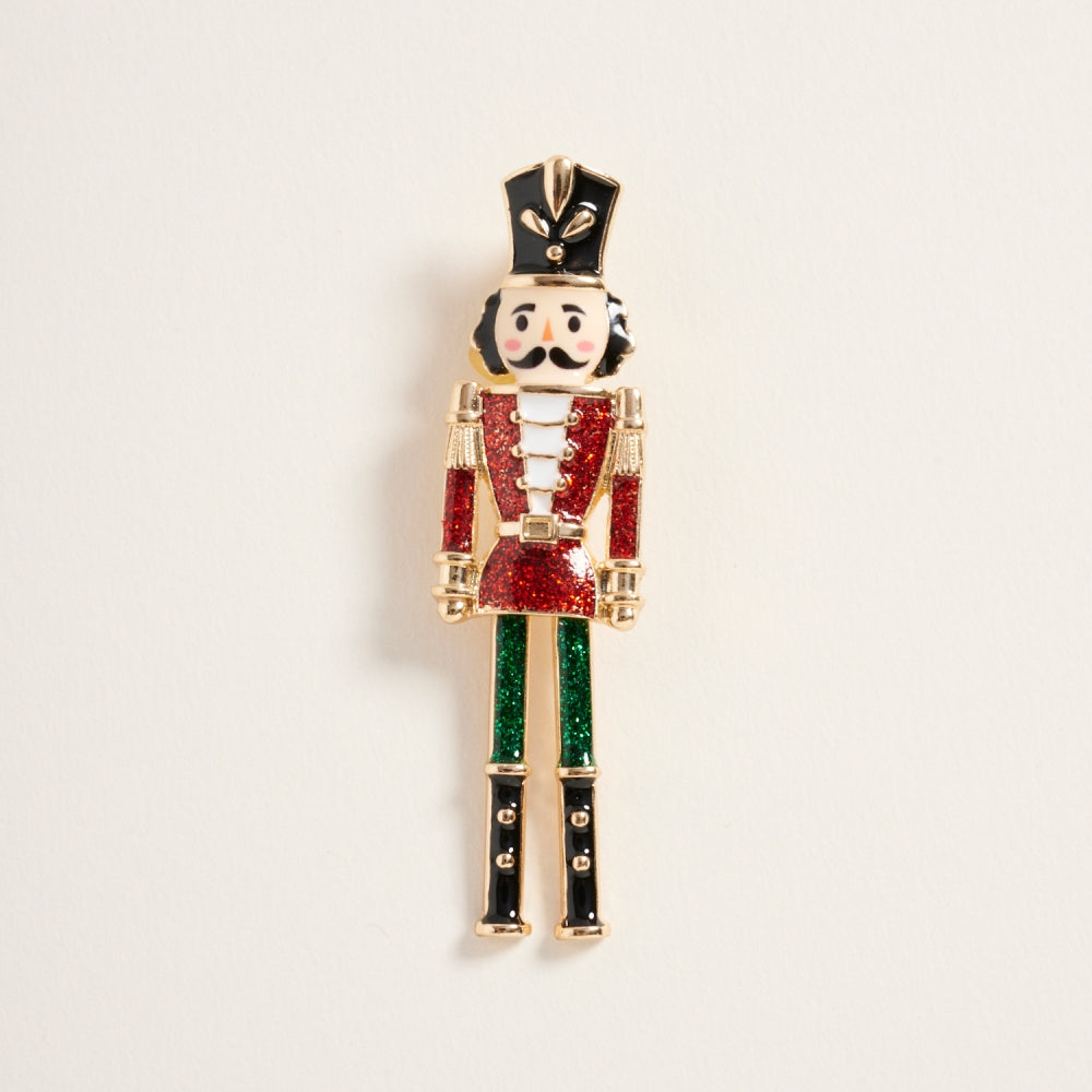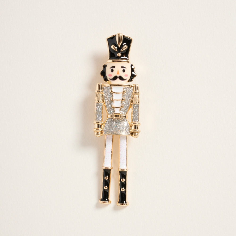 Brighten up your winter wardrobe with this glittered nutcracker pin, full of seasonal whimsy and shine.