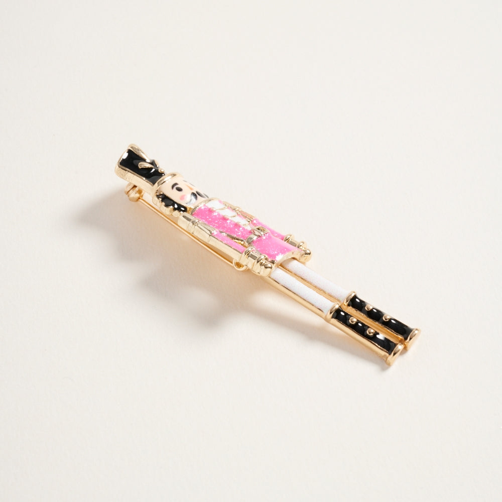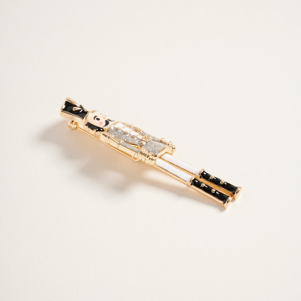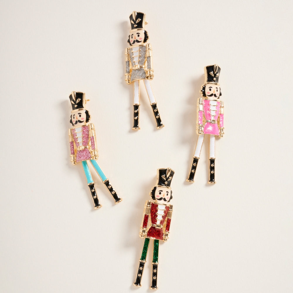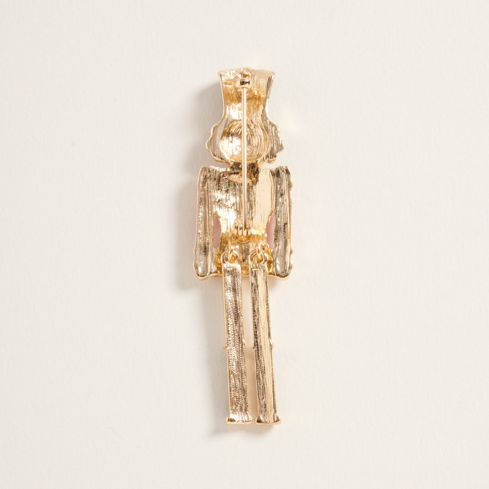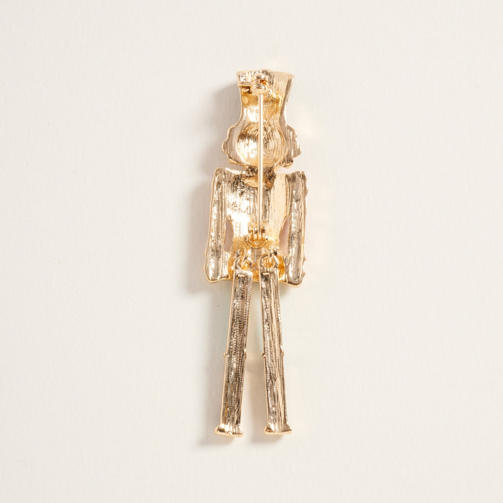 Brighten up your winter wardrobe with this glittered nutcracker pin, full of seasonal whimsy and shine.