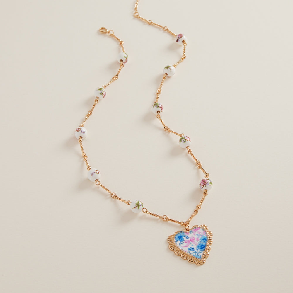 This 16 inch short necklace features a heart-shaped enameled charm with a printed pattern, accented by smooth ceramic beads for a playful yet refined look. Designed to rest near the collarbone, it adds a touch of color and charm to any outfit. Lightweight and easy to style, perfect for everyday wear or layering.
