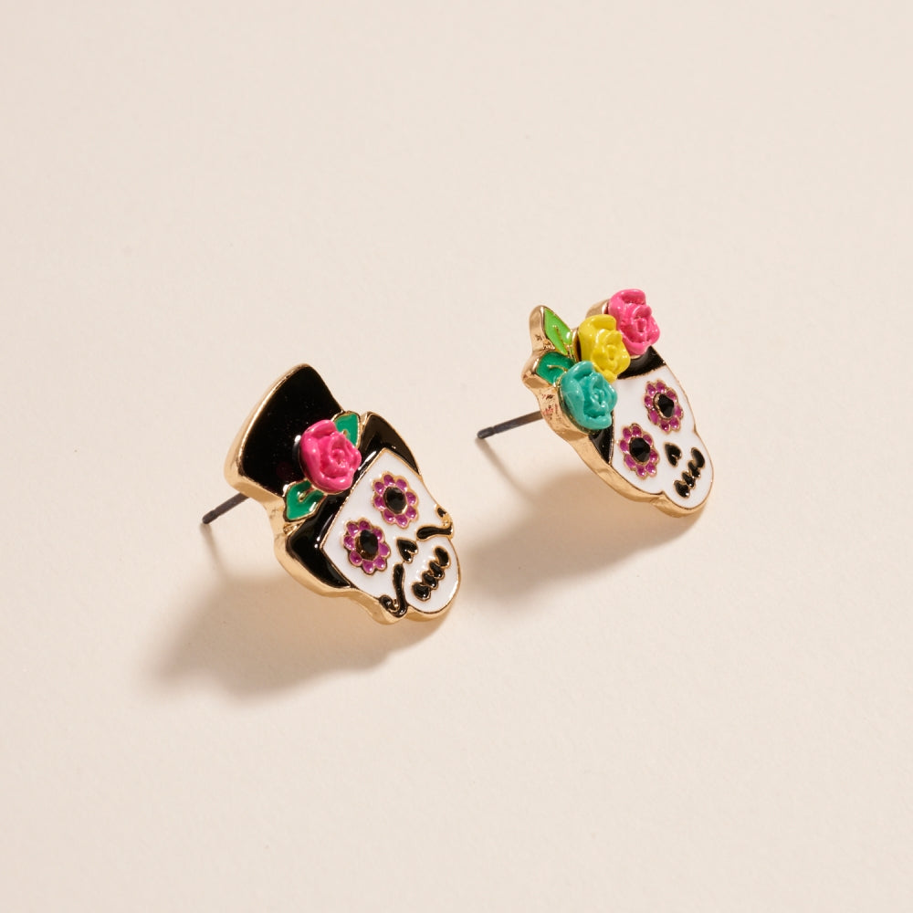 Celebrate the season with these enamel skeleton couple earrings. Featuring a charming duo in spooky style, they are a fun and lighthearted way to accessorize for Halloween. The post-back design ensures a secure and comfortable fit.