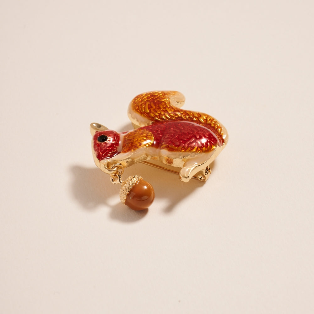 Celebrate the charm of fall with this adorable squirrel and acorn brooch. Designed with rich seasonal tones, its the perfect playful accent for your sweater, scarf, or jacket. A cozy touch for autumn days.