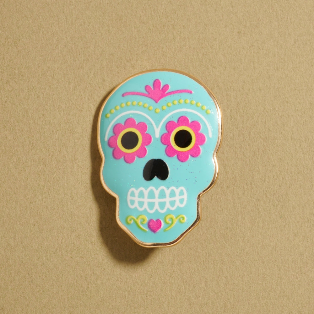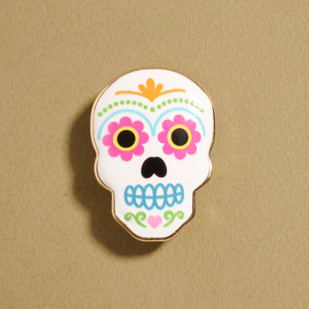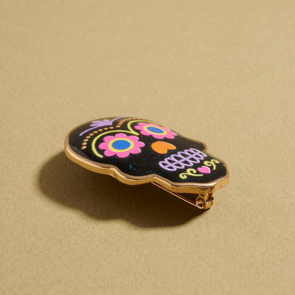 Celebrate Halloween and Day of the Dead traditions with this colorful sugar skull brooch. A bold and festive accent for jackets, bags, or scarves. A great seasonal piece for any outfit.