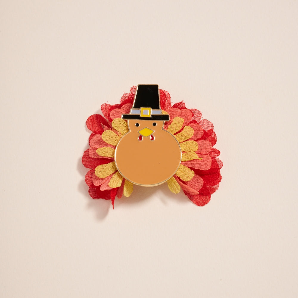 Celebrate the season in style with this charming turkey brooch. Complete with a festive hat, it adds a fun and whimsical touch to your Thanksgiving look.