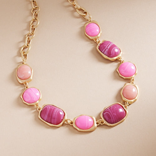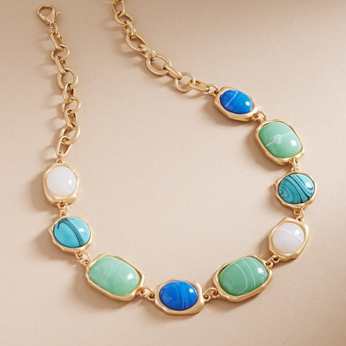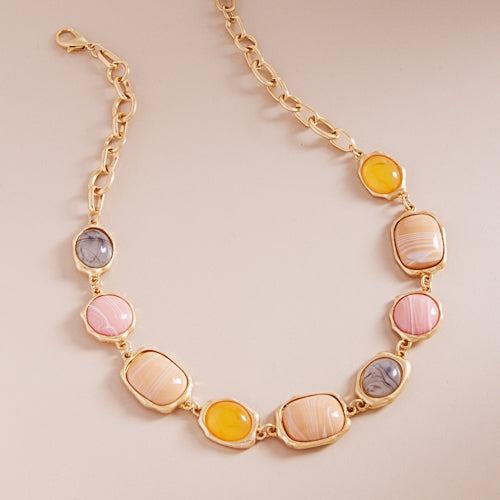 This playful necklace features vintage-look resin stones in soft, mixed tones. The variety of shapes and subtle colors add just the right amount of charm to your neckline.