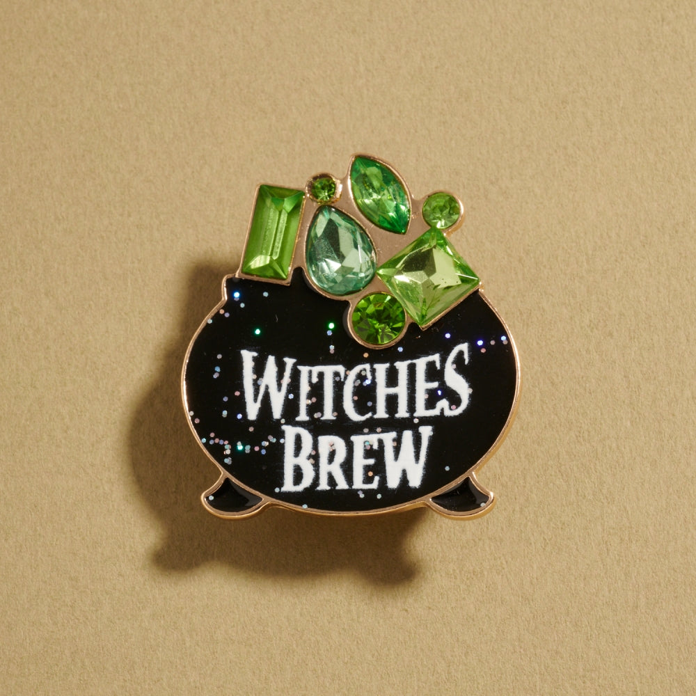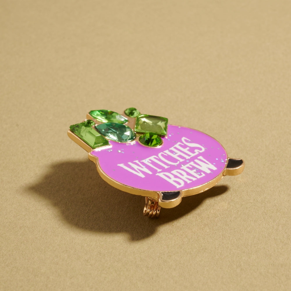 Celebrate Halloween with this witches brew pin. The vibrant enamel and shimmering rhinestones make it a festive piece for jackets, bags, or hats.