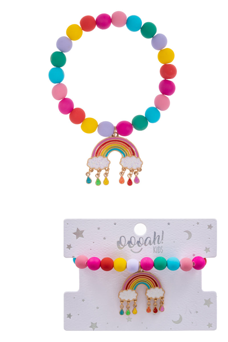 This colorful 6.25 inch stretch bracelet is perfect for kids, featuring a rainbow design and playful tassel detail. Made with high quality materials, it is durable and comfortable for little ones to wear. Encourage imagination and creativity with this fun accessory.