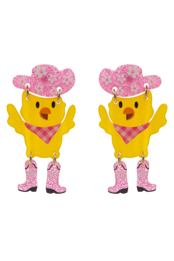 These 1.75 inch Easter chick shaped earrings are made from hypoallergenic titanium, perfect for those with sensitive ears. Each earring features a cute western hat and boots design, adding a unique touch to your accessory collection. Get ready for Easter with these adorable and comfortable earrings.