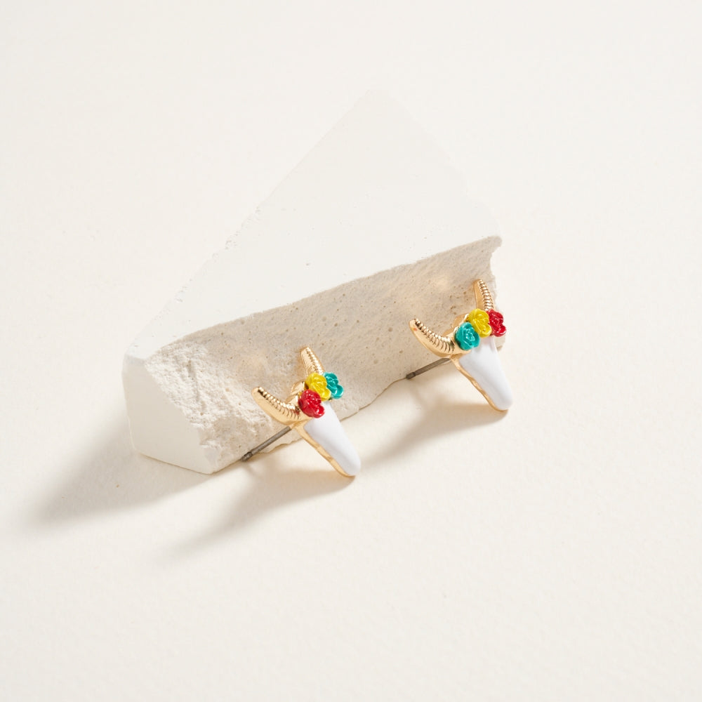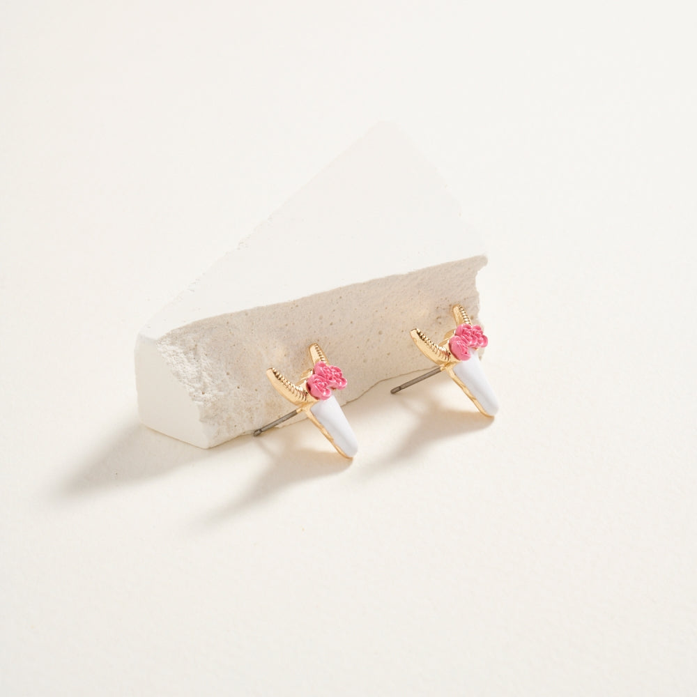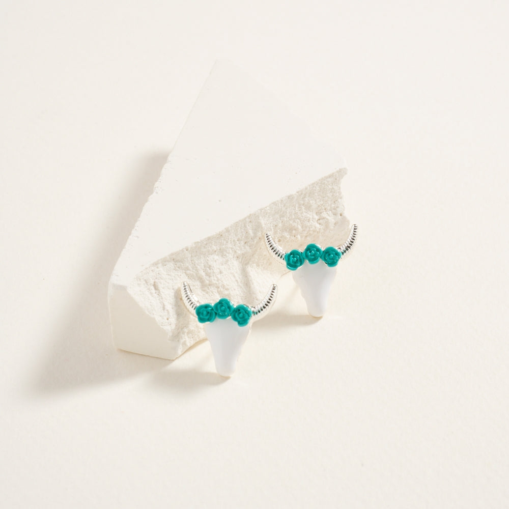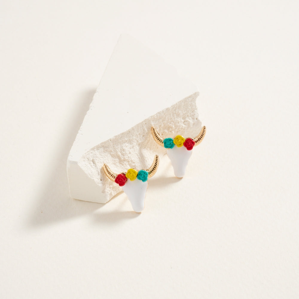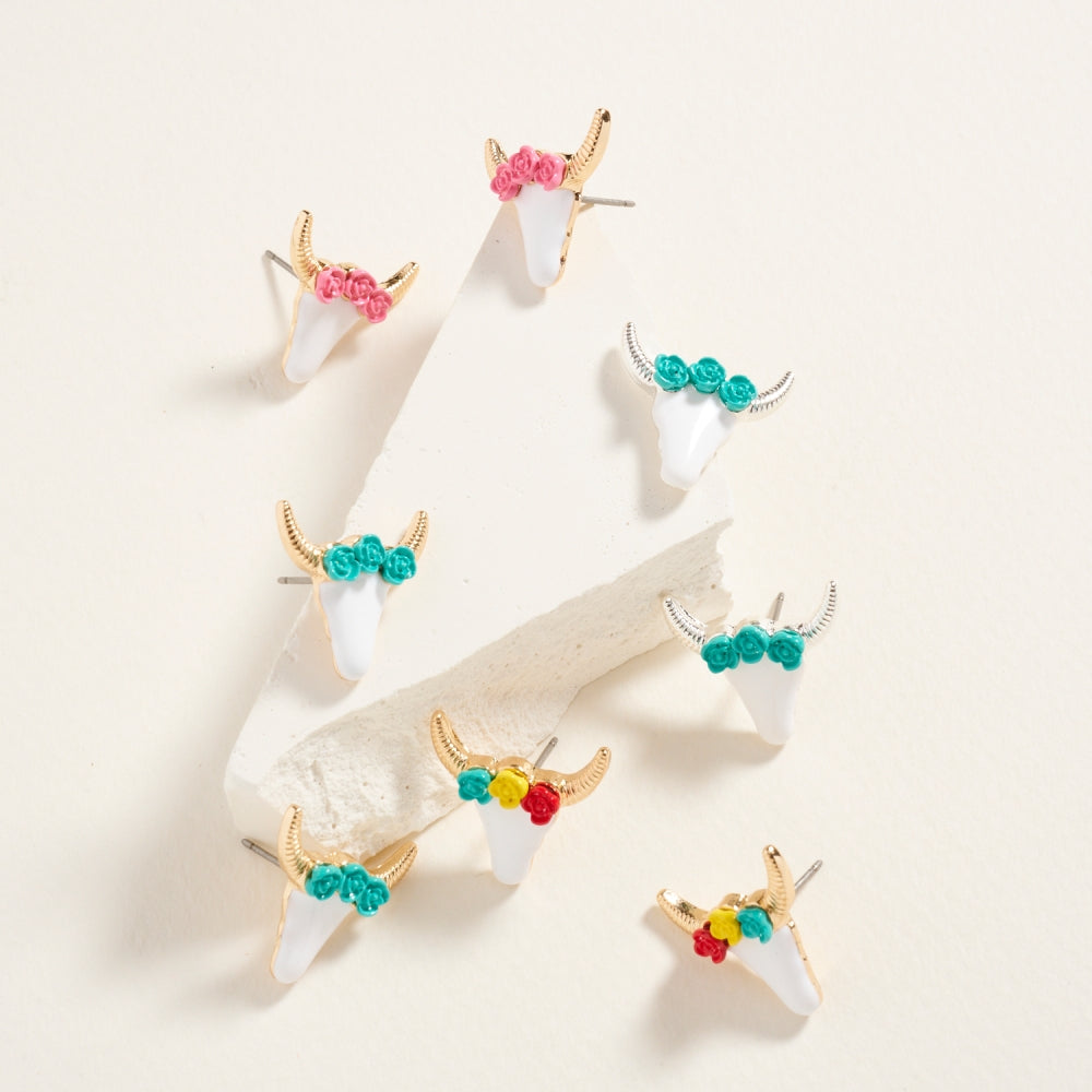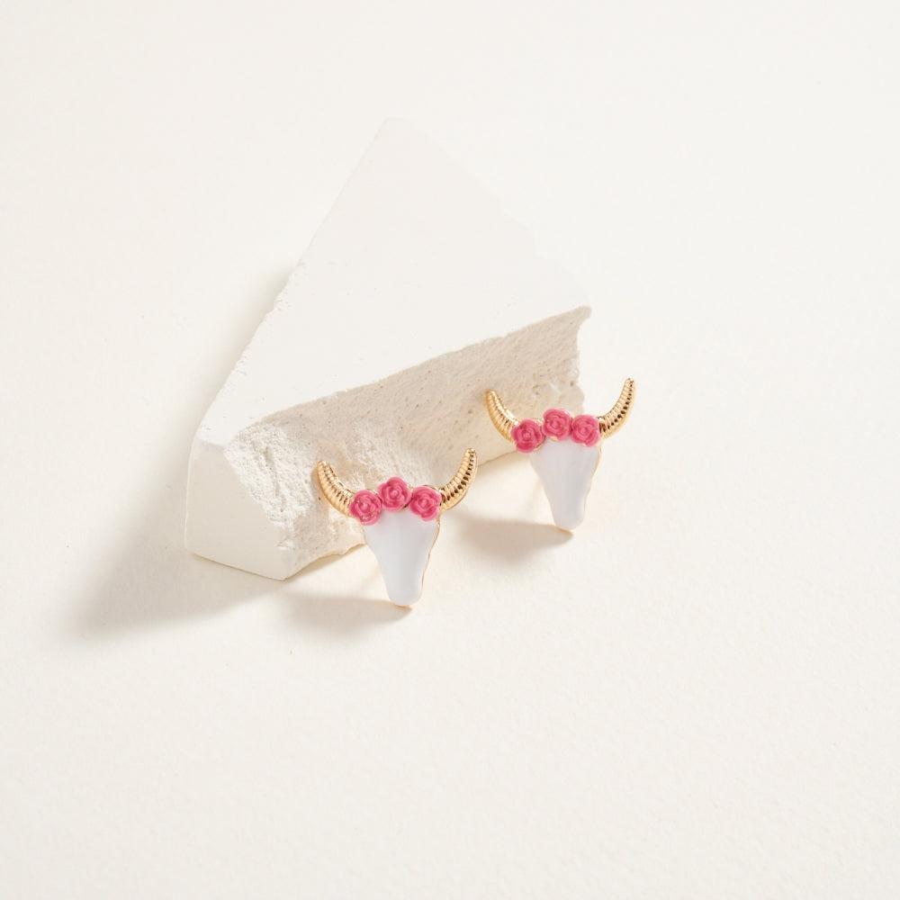 Celebrate Western style with these earrings showcasing iconic longhorn steer heads adorned with floral accents. A unique accessory for rodeo nights and casual outfits.