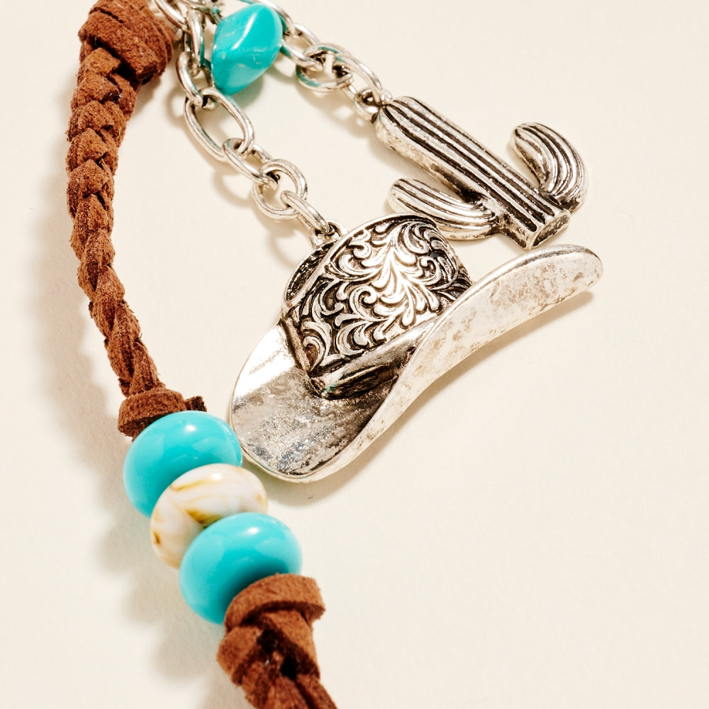 This braided cowgirl hat charm features semi-precious stone details for a subtle pop of color and texture. A perfect mix of rustic Western flair and modern boho style.