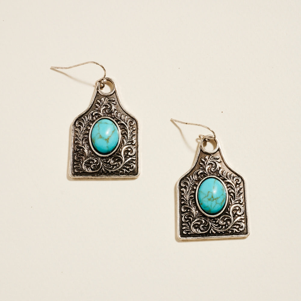 Featuring a cow tag silhouette paired with earthy semi-precious stones, these hook earrings capture the perfect blend of cowgirl edge and artisanal detail.
