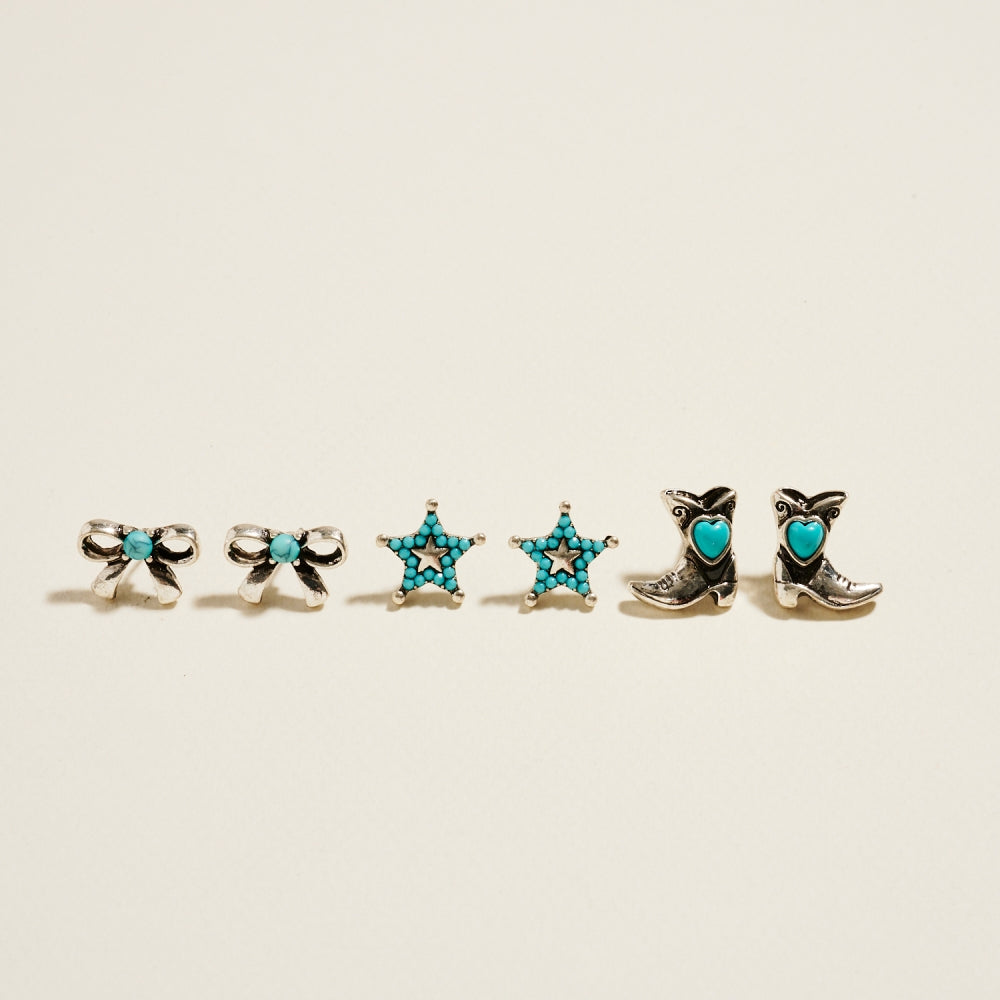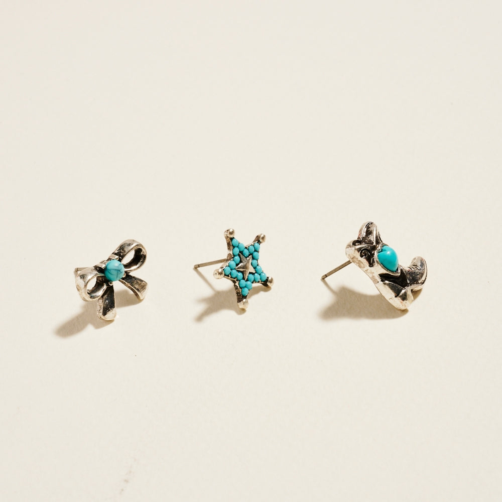 Bring a touch of rodeo flair to your look with this 3-piece earring set featuring turquoise accents, star motifs, bows, and cowboy boots. Perfect for mixing and matching to create your own cowgirl-inspired look.