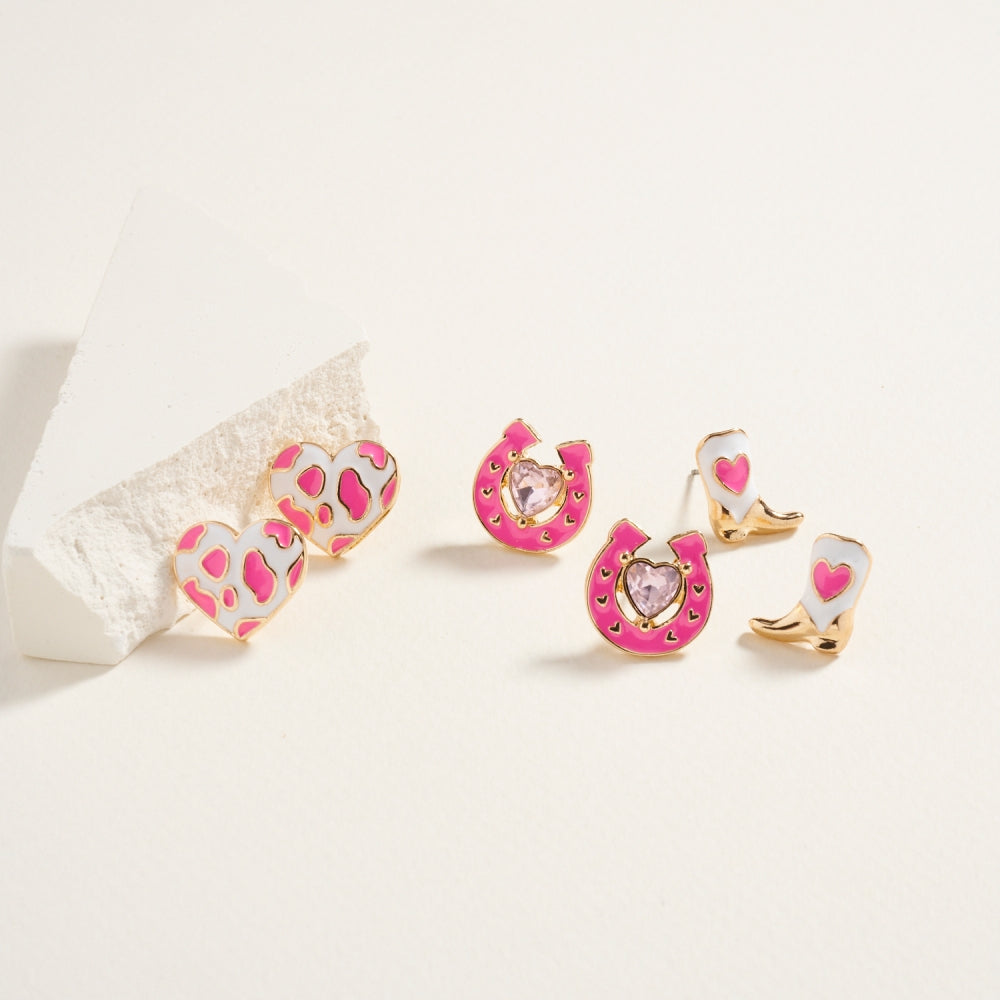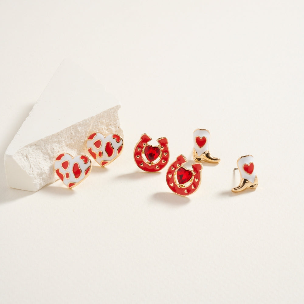 Add a touch of romance to your Western look with this earring trio. Designed with boots, hearts, and lucky horseshoes, it’s a fun Valentine’s Day gift idea.