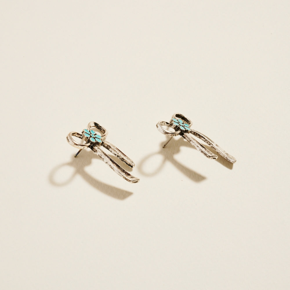 Crafted with vintage appeal, these post earrings pair turquoise floral details with metallic bow ribbons. A lovely statement for anyone who adores a soft, boho-inspired charm.