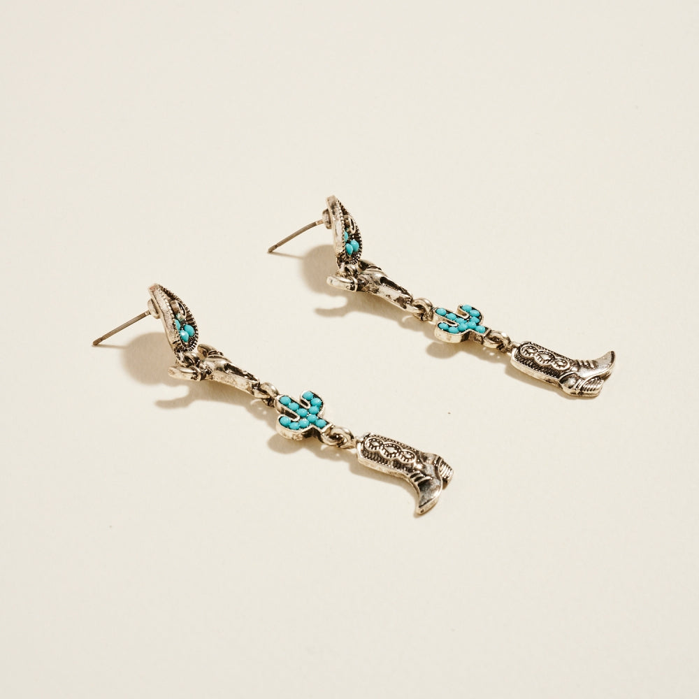Celebrate true Western spirit with these dangle post earrings featuring cowgirl hat, boot, steer head, and cactus charms. Their linked design adds playful movement and rustic elegance.