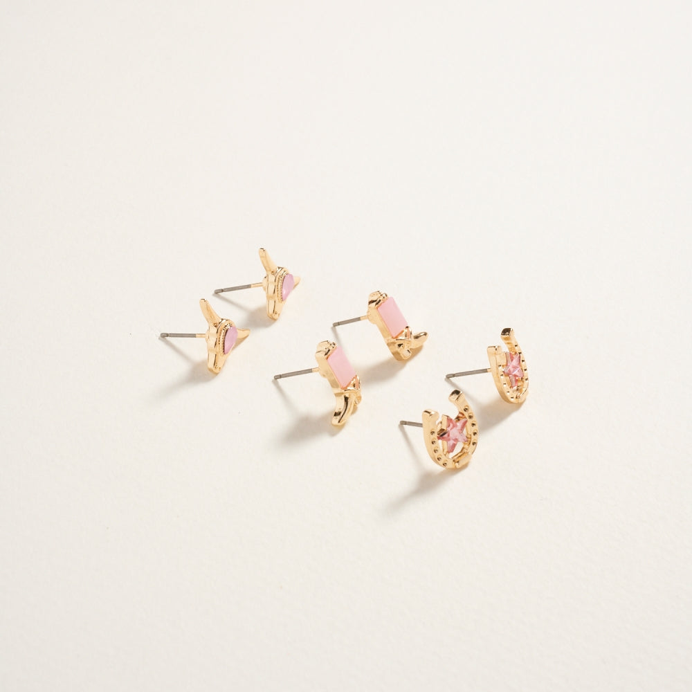 Add Western sparkle to your collection with this cowgirl-themed 3-piece set. Rhinestone accents make each pair stand out for rodeo nights and casual wear.